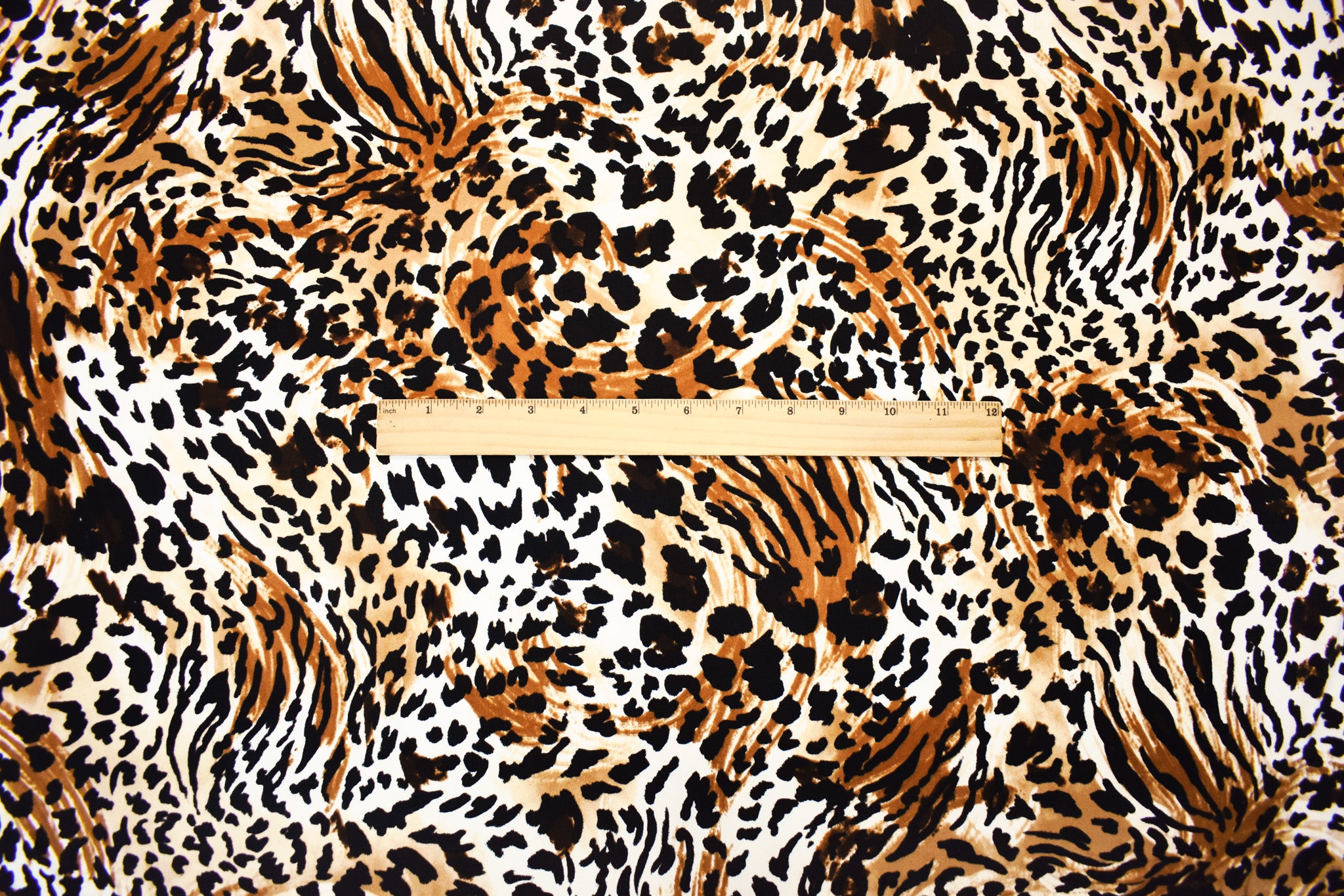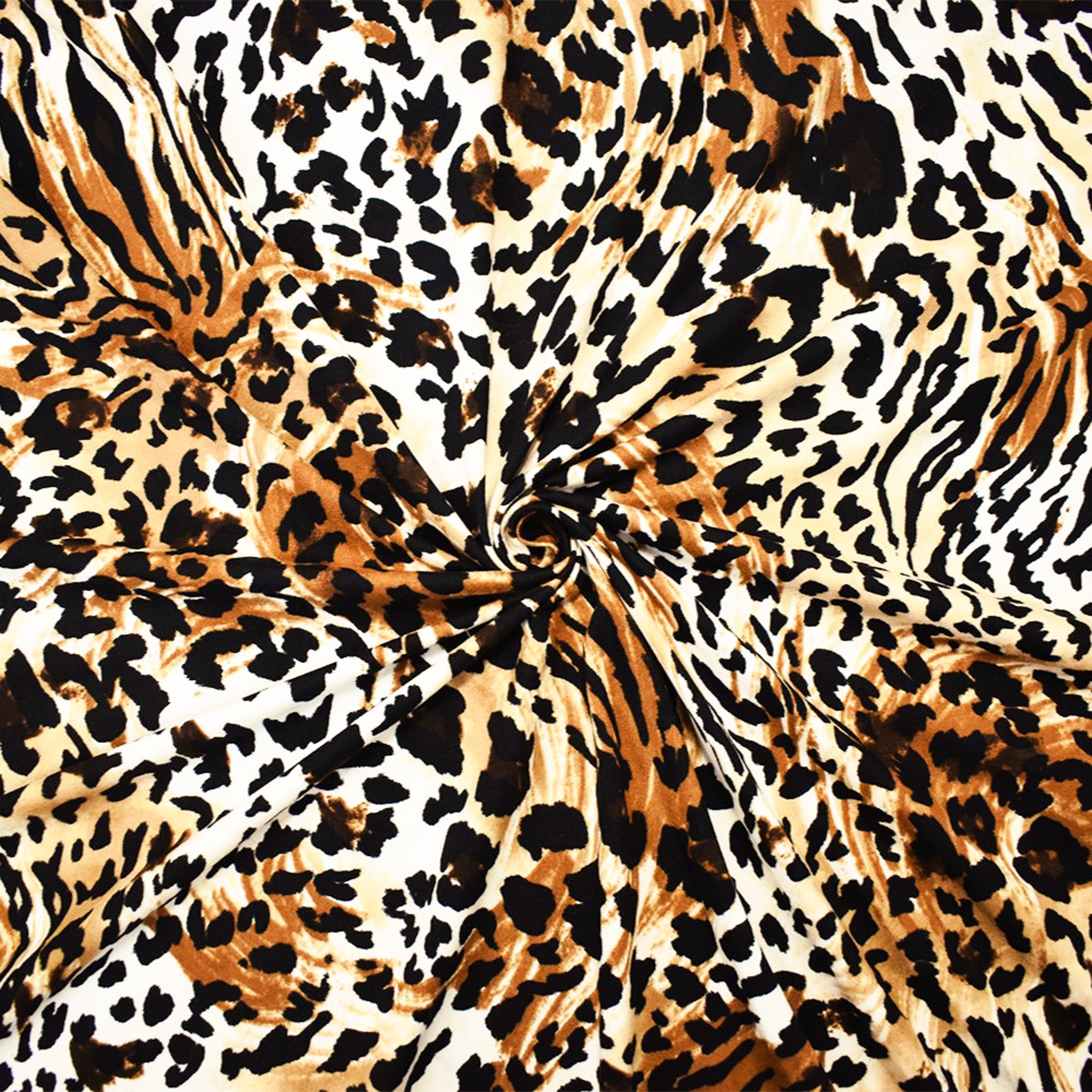 -This polyester-spandex jersey knit fabric features a bold cheetah print in a stylish brown, black, and multi-color palette, perfect for trendy, statement garments. The stretchy, durable, and soft material offers comfort and flexibility, making it ideal for fitted tops, leggings, and dresses. Its lightweight, breathable quality ensures a flattering drape while maintaining shape retention for long-lasting wear.