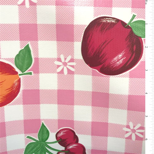 Red, Orange, Green, Brown, and White Apples, Cherries, Peaches, and Daisies on Pink and White Check Oilcloth Fabric