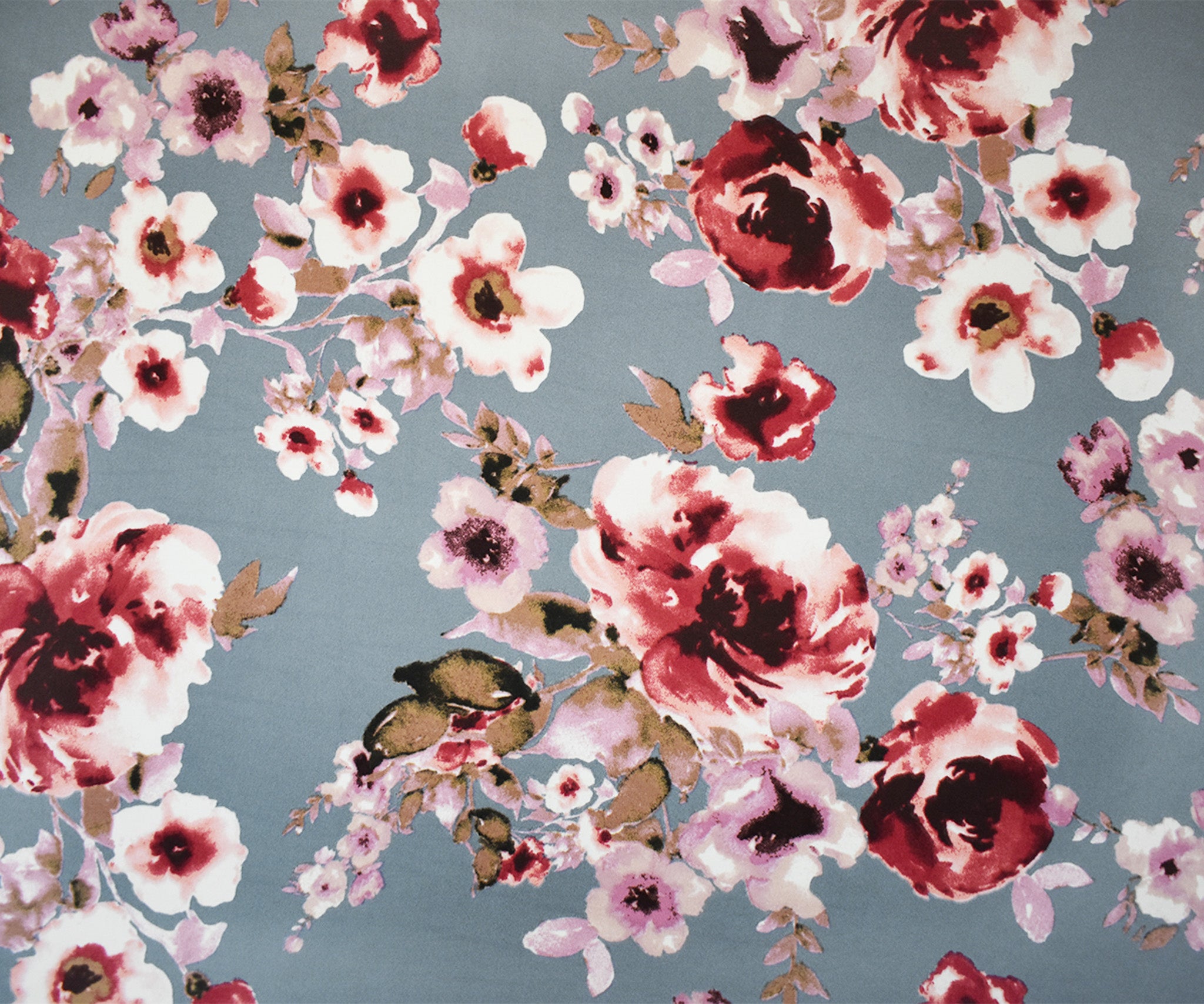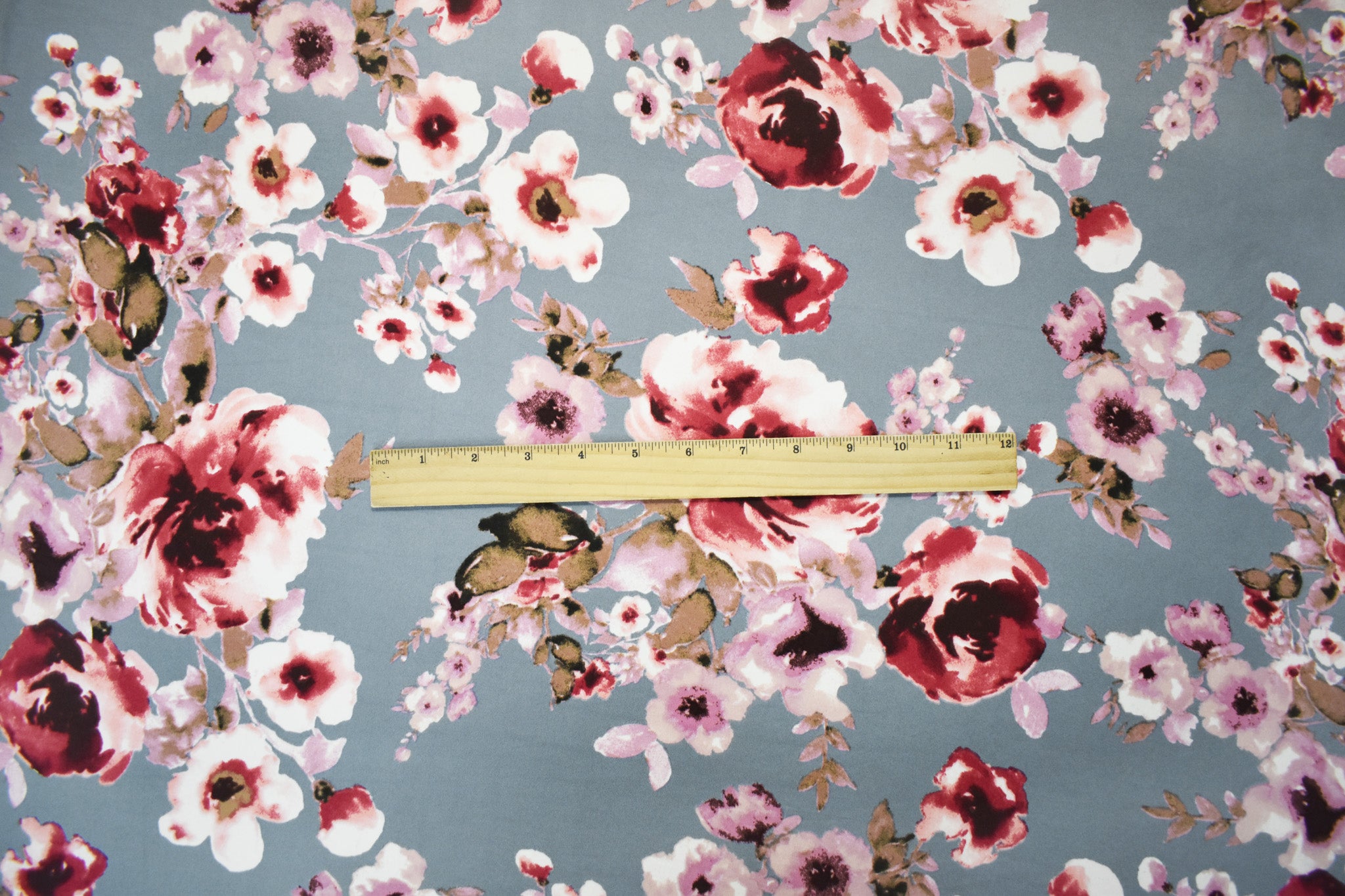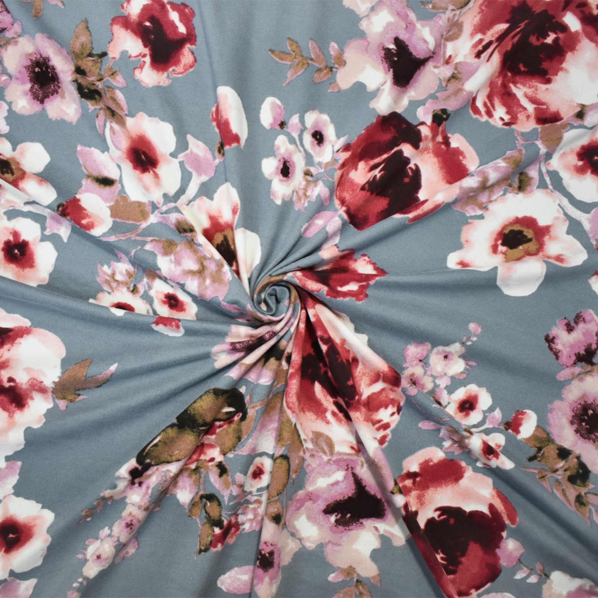 -This polyester-spandex double-side brushed jersey knit fabric features a soft floral print in an elegant gray and multi-color palette, with both sides brushed for an ultra-luxurious, plush feel. The four-way stretch construction provide exceptional comfort, flexibility, and a beautiful drape, ideal for flowy dresses, lounge sets, and cozy tops. Its breathable, velvety texture offers lightweight warmth while maintaining excellent shape retention for durable, comfortable wear.