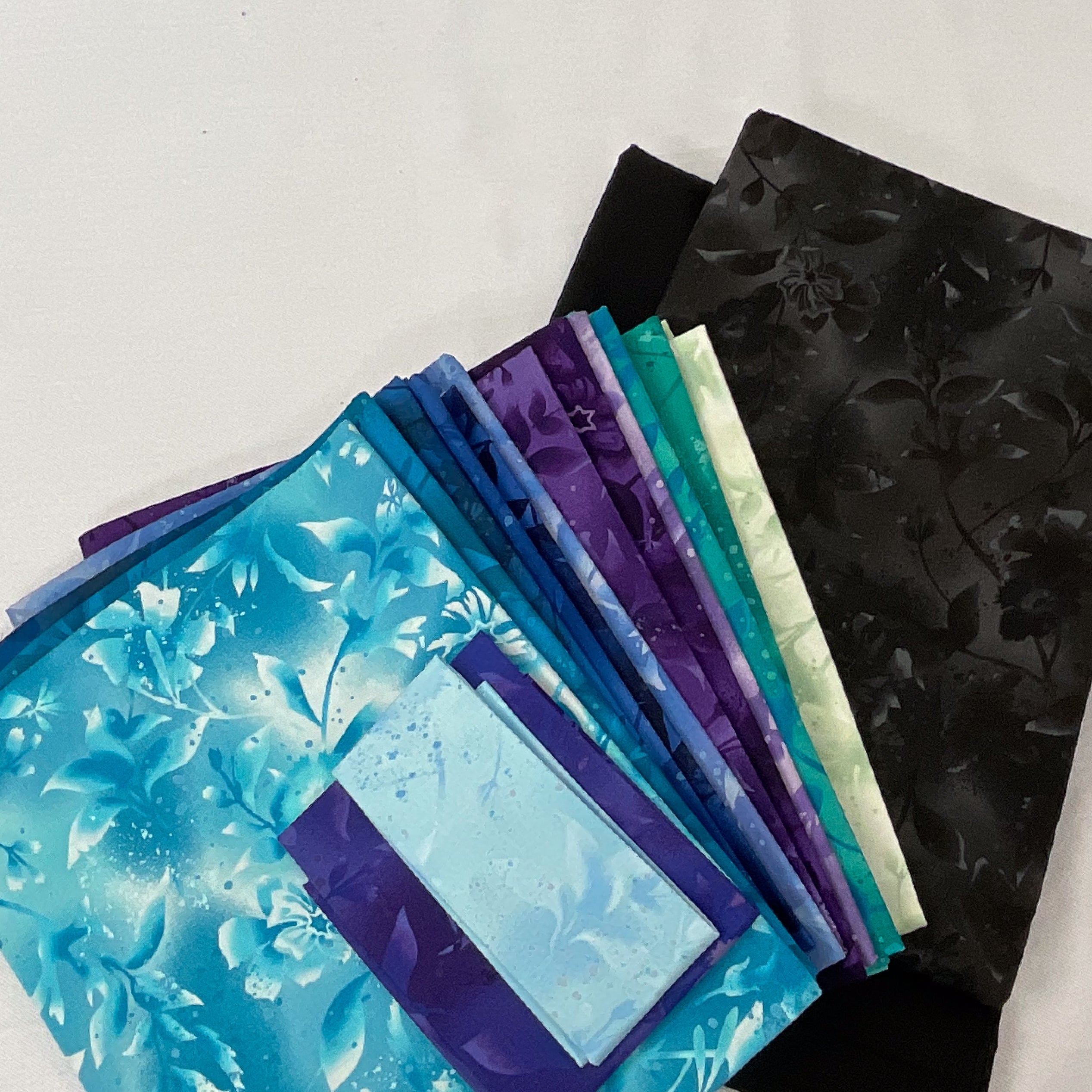 - Bundle fabrics include: 5/8 yd teal floral tonal, 1/2 teal floral tonal, 3/4 purple floral tonal, 1/8 yd light blue floral tonal, 1/4 yd deep purple floral tonal, 3/4 yd deep purple floral tonal, 3/8 yd deep blue floral tonal, 3/8 yd mint green floral tonal, 3/4 yd blue floral tonal, 3/4 yd blue/blue floral tonal, 3/4 yd blue/black flroal tonal, 1 yd deep teal floral tonal, 1 yd aqua teal white floral tonal, 3 yds black/grey floral tonal, 3/4 yd green/teal floral tonal, 3/8 yd purple floral tonal, 3 1/2 yds black solid. Pattern is not included
