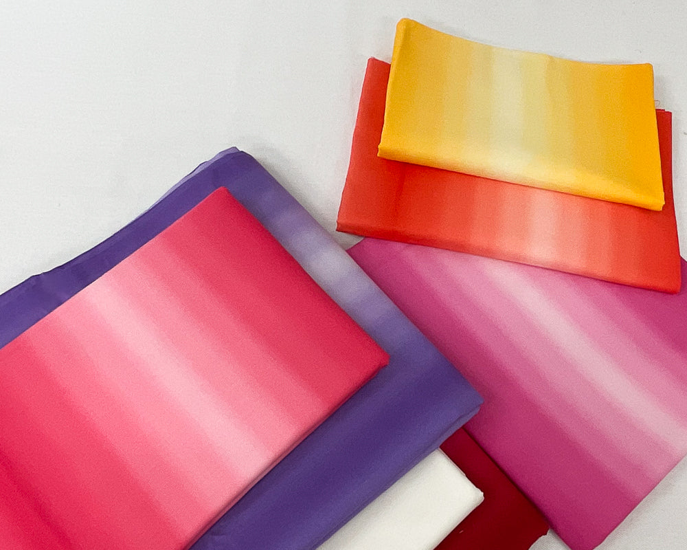 - Bundle fabrics include: 3/4 yd yellow ombre, 1 1/4 yd orange ombre, 1 1/4 yd pink ombre, 1 1/2 yd hot pink stripe ombre, 3 yds red stripe ombre, 3 1/8 yds purple stripe ombre, 3 1/8 yds white solid. Pattern is not included