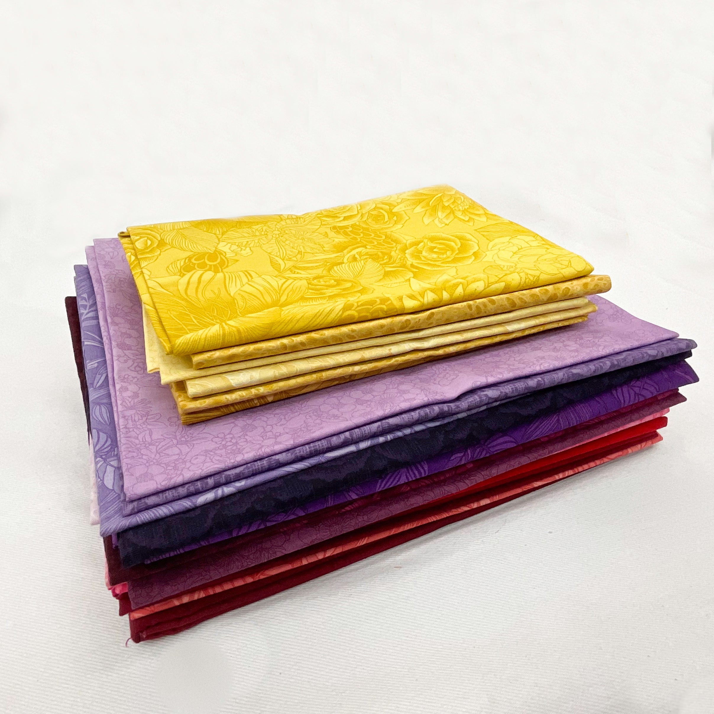 - Bundle fabrics include: 5/8 yd purple tonal cloud, 5/8 yd coral red leaves, 5/8 yd red tonal scribble, 5/8 yd red tonal floral, 5/8 yd red rose floral, 5/8 yd bright red floral, 1/2 yd yellow pebble, 1/2 yd yellow tonal rose, 1/2 yd yellow tonal floral, 1/2 yd yellow floral, 5/8 yd fuchsia leaf, 5/8 yd pink tonal floral, 5/8 yd lt pink pebble, 5/8 yd lt pink floral, 5/8 yd tonal purple floral, 5/8 yd wine purple floral, 5/8 yd deep red purple floral, 5/8 yd mustard floral, 5/8 yd lt purple pebble, 5/8 yd periwinkle purple floral, 5/8 yd deep purple clouds, 1/2 yd yellow pebble tonal, 5/8 yd purple tonal leaf, 5/8 yd black purple cloud, 5/8 yd purple leaf, 2 yd red tonal scribble. Pattern is not included