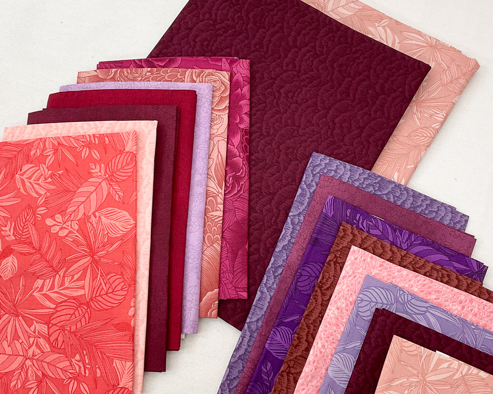 - Bundle fabrics include: 1 yd dusty pink leaf, 1 yd deep purple cloud, 1 fat quarter each, of the following: dark burgundy cloud, light pink cloud, brown cloud, pink pebble, purple leaf, dusty pink leaf, purple cloud, red scribble, purple leaf, wine purple floral, light purple floral, pink red floral, burgundy floral, burgundy tonal floral, coral red floral. Pattern is not included. Pictured is one possible version that could be made with this bundle.