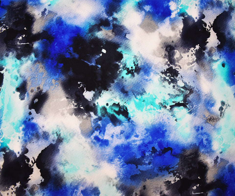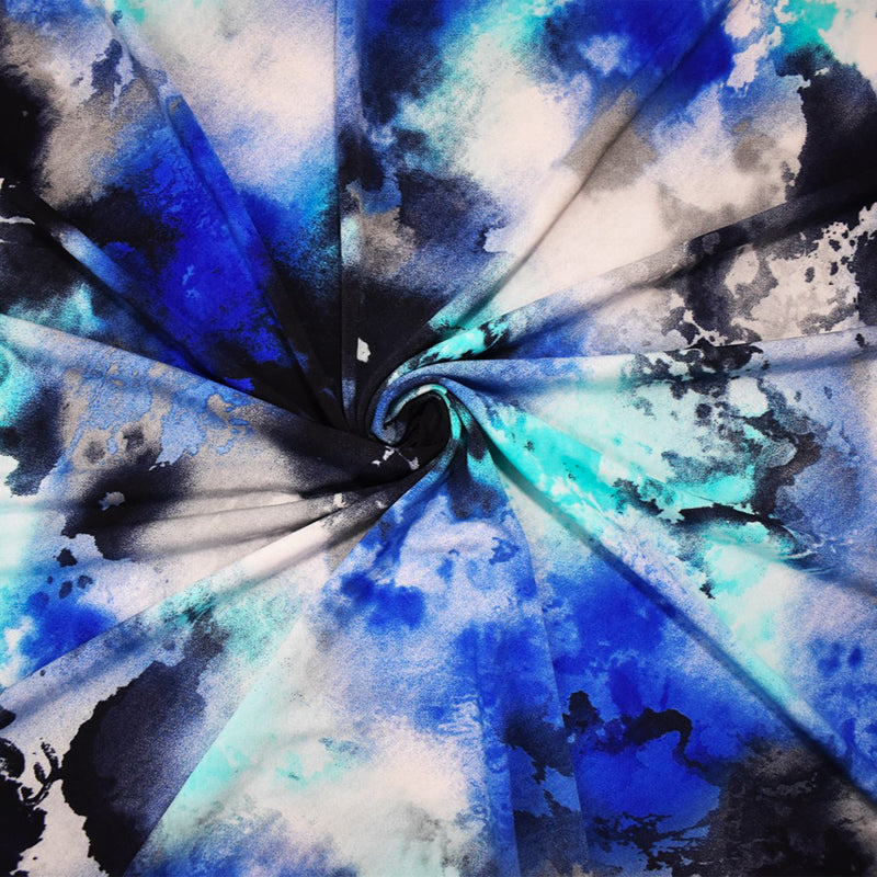 -Poly stretch spandex ITY knit fabric printed with an abstract watercolor inspired pattern