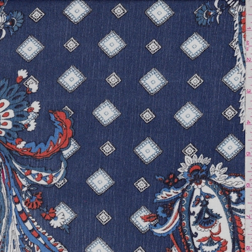 Navy/White/Orange Stylized Paisley Crepon Fabric