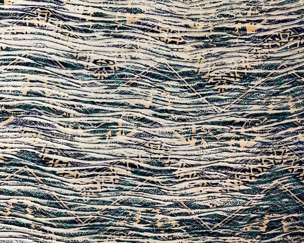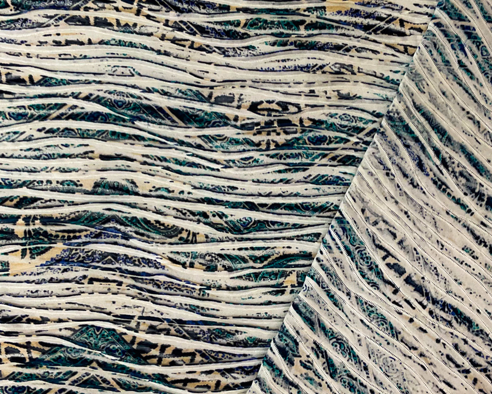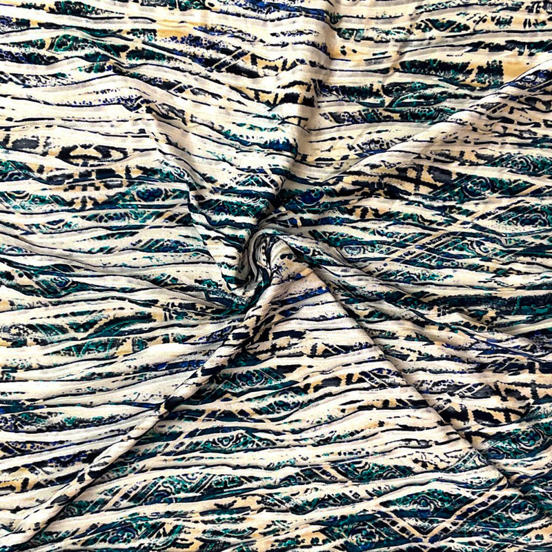 Blue-Turquoise-Multi Poly Chevron Printed Knife Pleat Knit Fabric