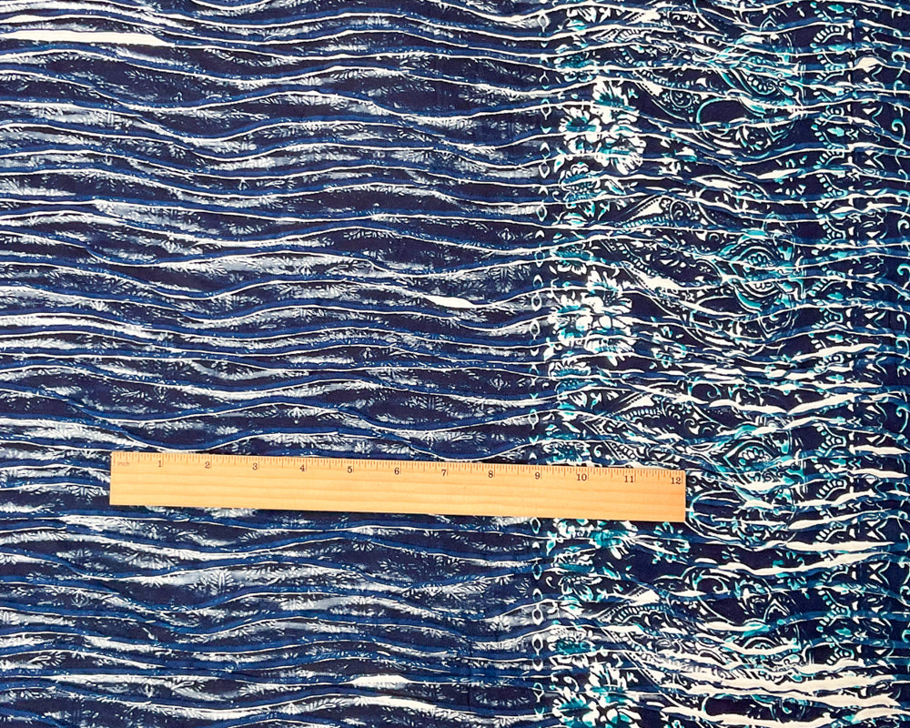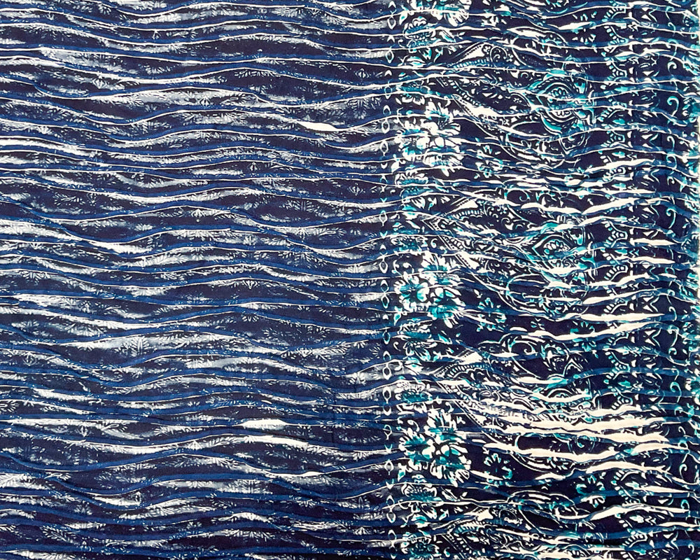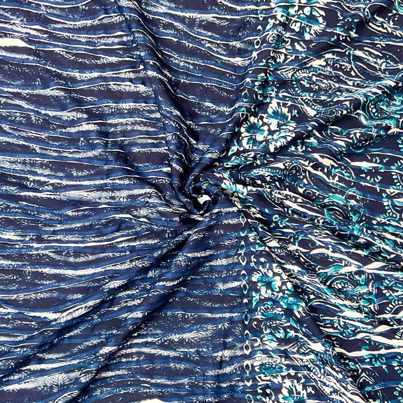 Blue-White Poly Baroque Floral Border Printed Knife Pleat Knit Fabric
