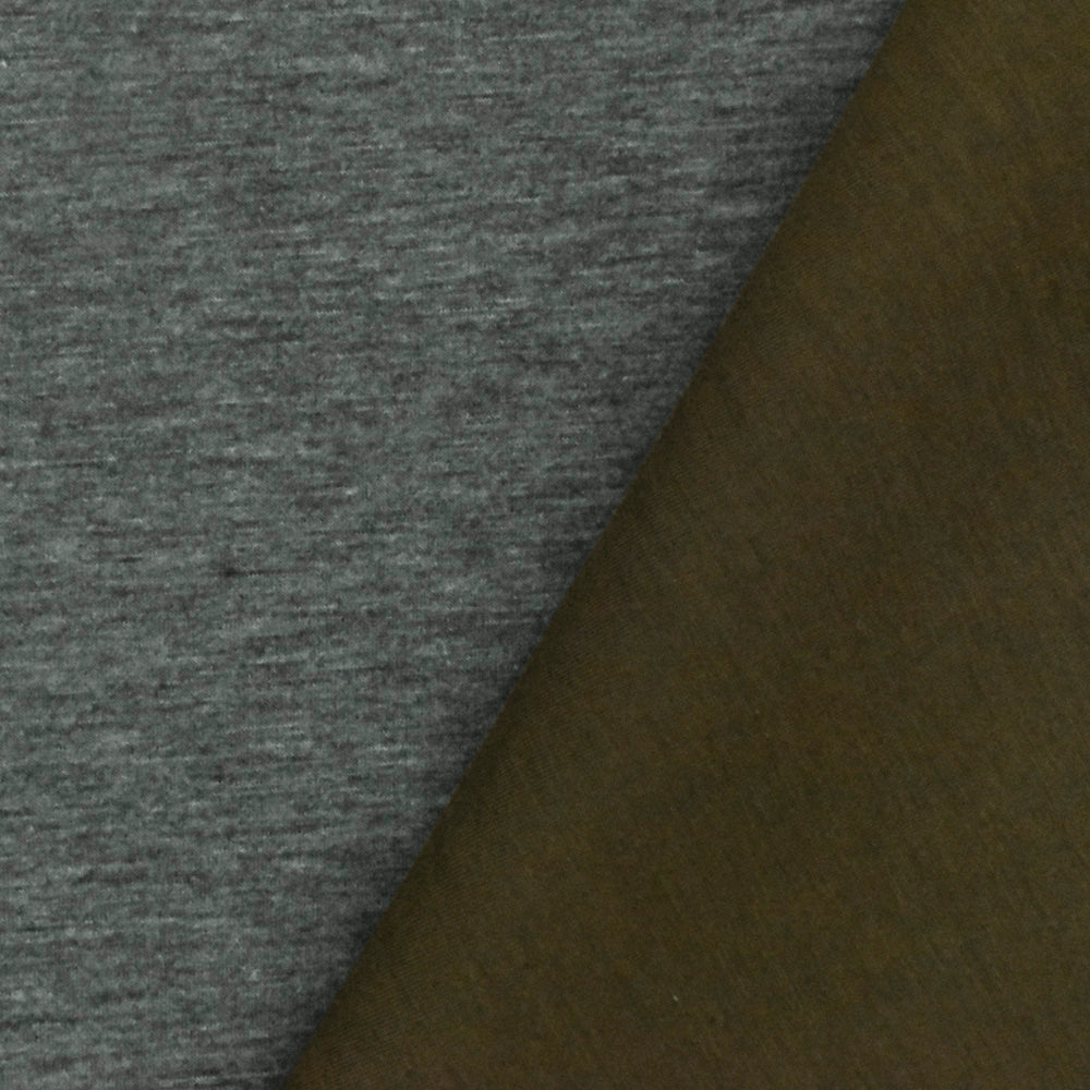 -Reversible bonded fabric featuring a heather gray knit surface on one side, and an olive-brown solid surface on the reverse. This fabric features a thin foam sandwiched in between,
