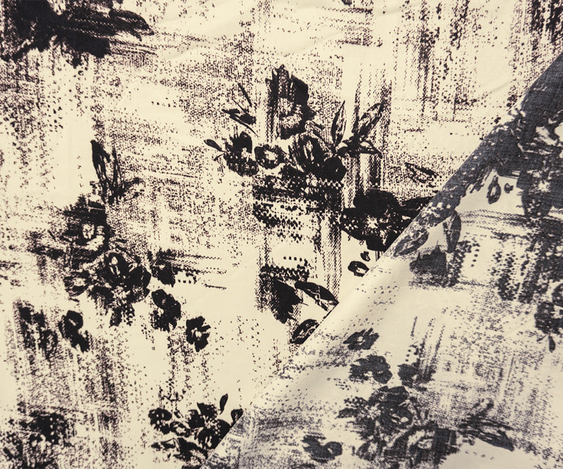 Ivory-Black-Brown Rayon Abstact Floral Printed Twill Woven Fabric