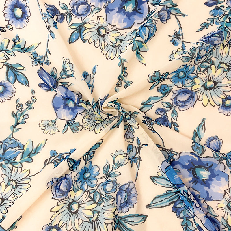 Ivory-Blue-Multi Poly Floral Printed Chiffon Woven Fabric