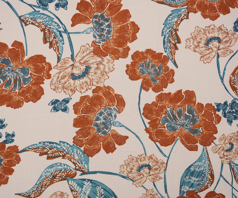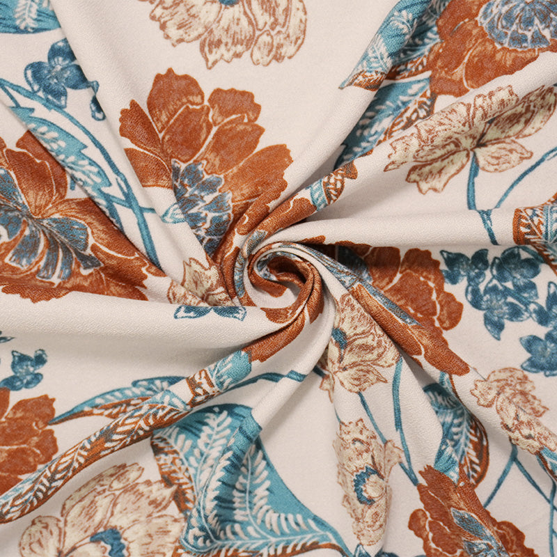 Ivory-Brown-Teal Rayon Floral Printed Momie Crepe Woven Fabric
