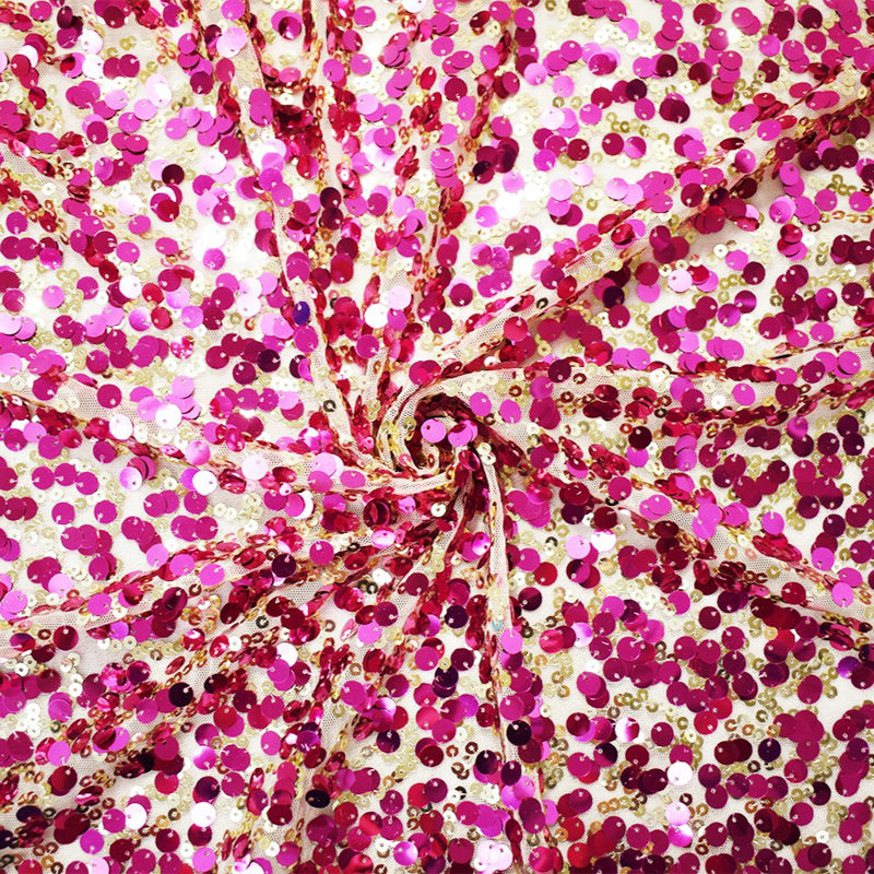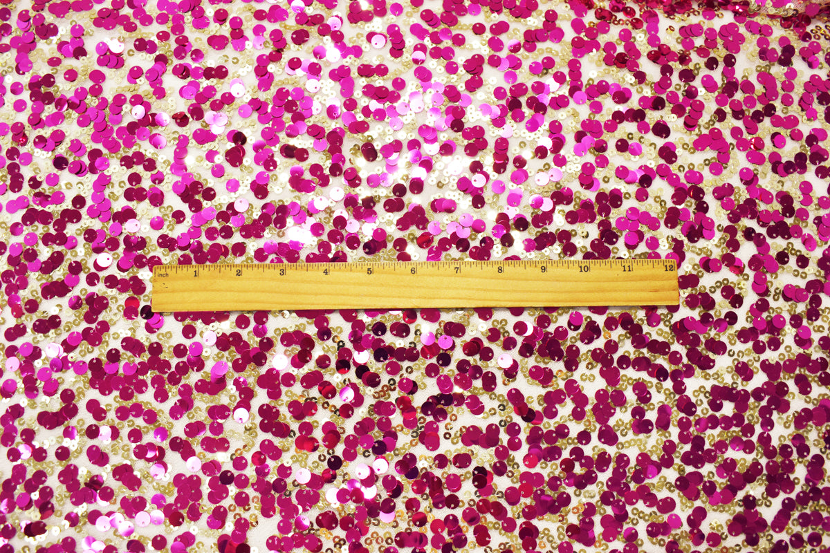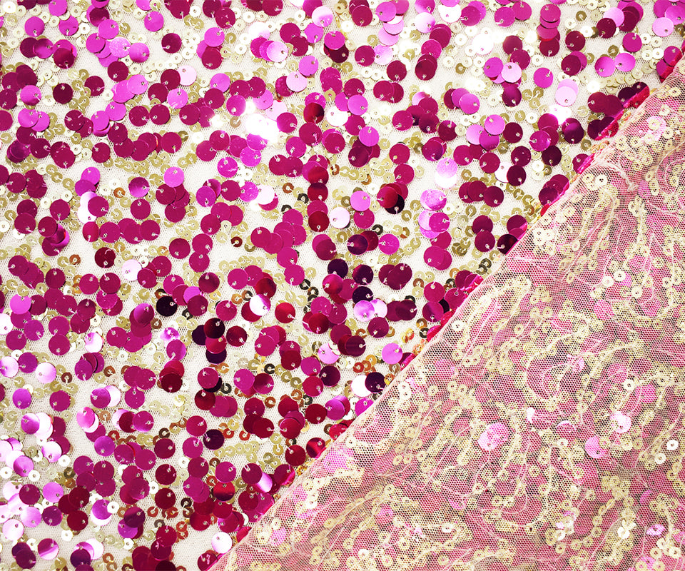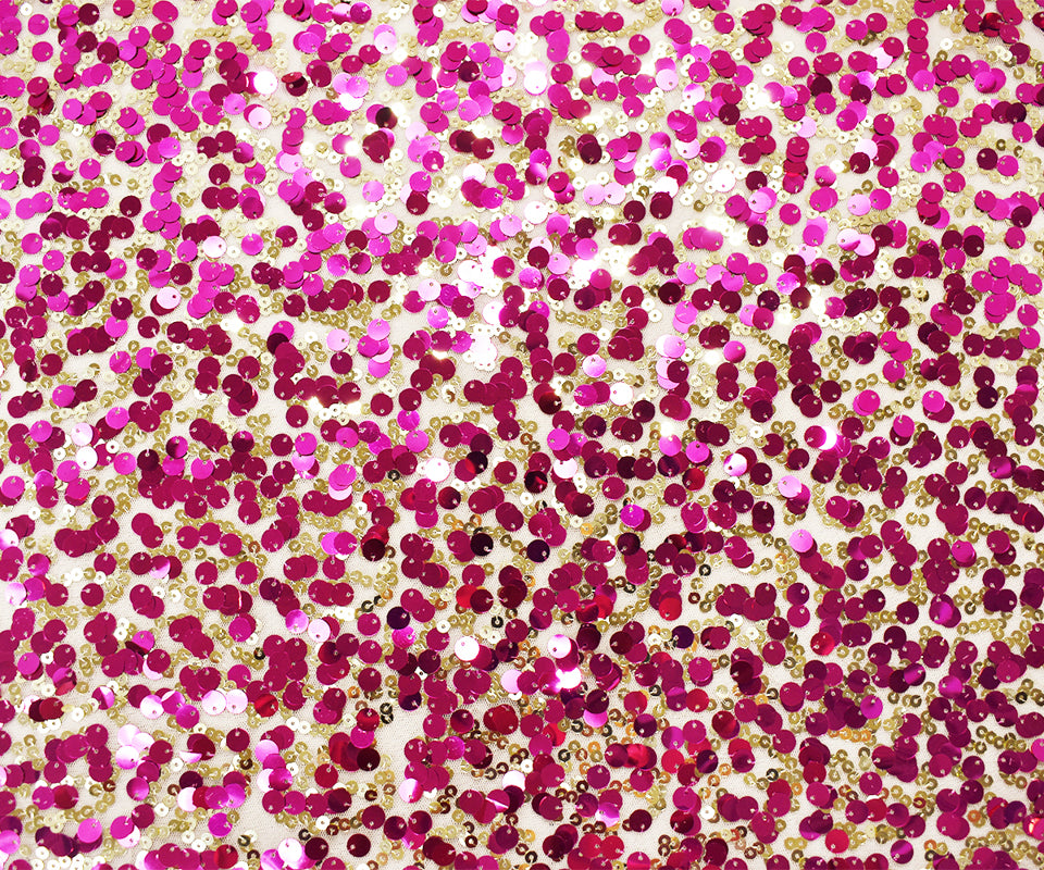 Fuchsia Pink-Gold-Beige Nylon Sequined Mesh Tulle Fabric