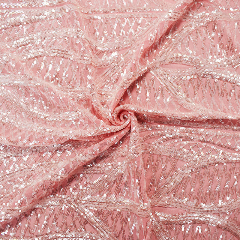 Pink-Pearl-Iridescent Nylon Abstract Wave Sequined Mesh Knit Fabric