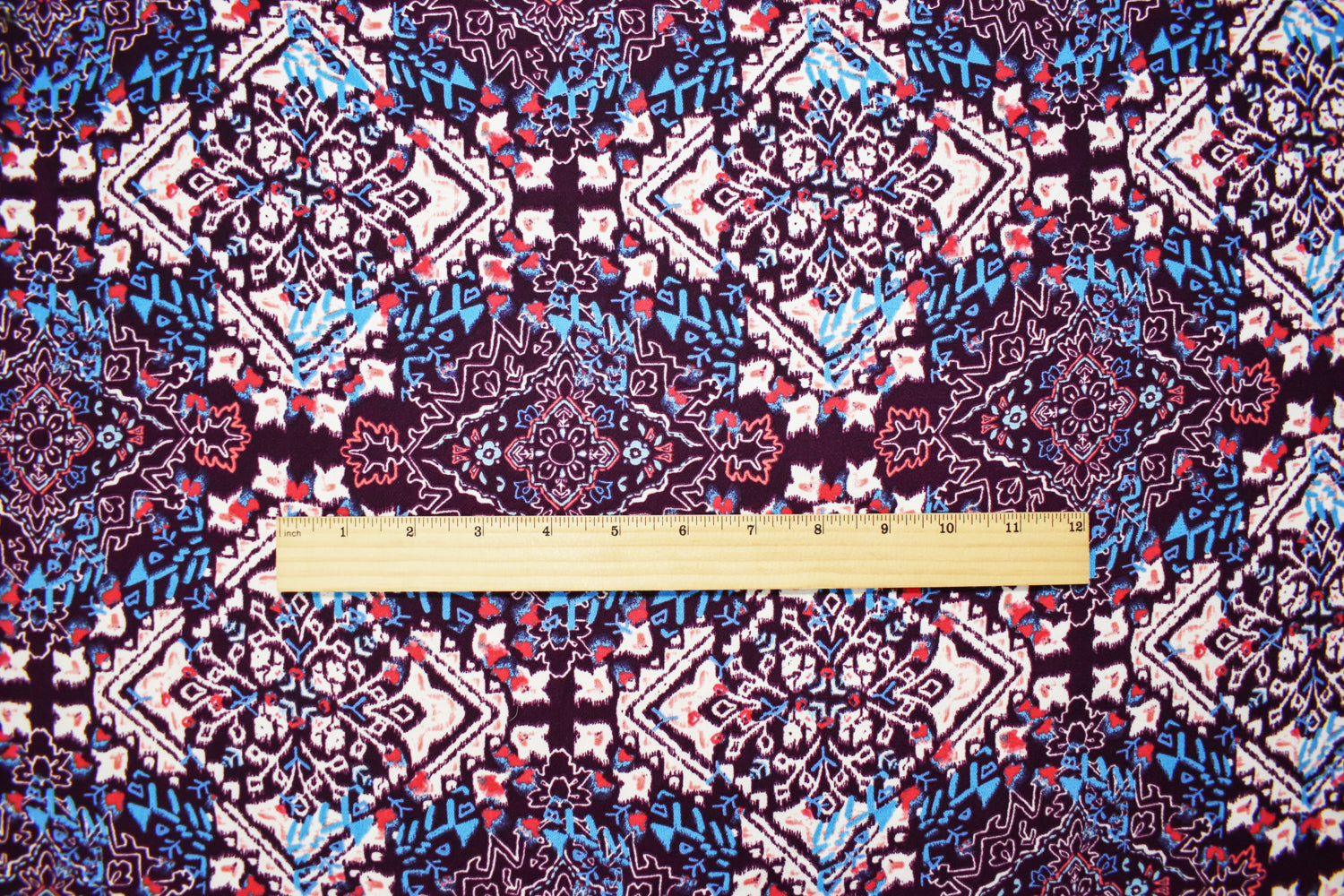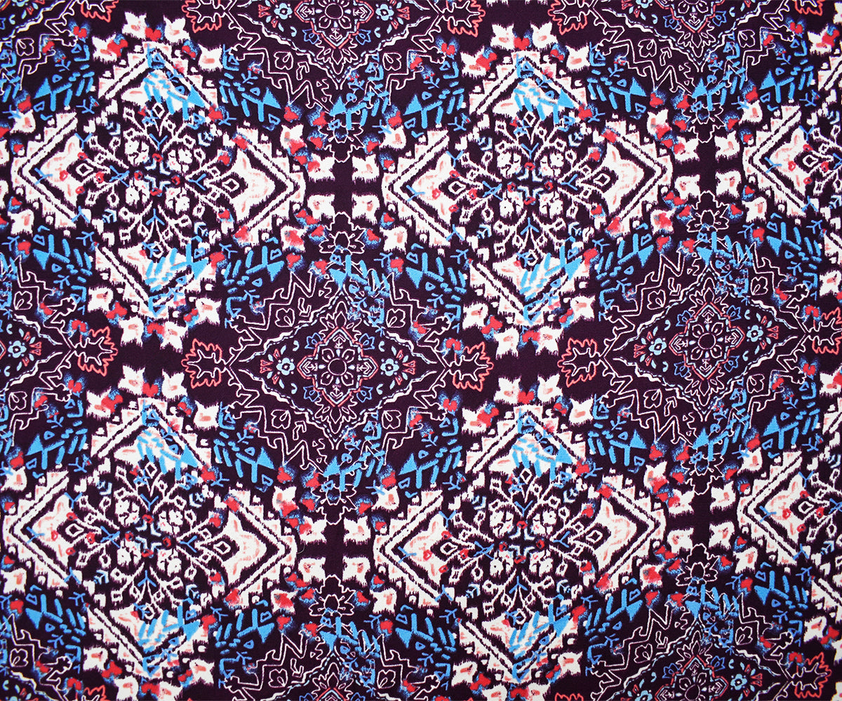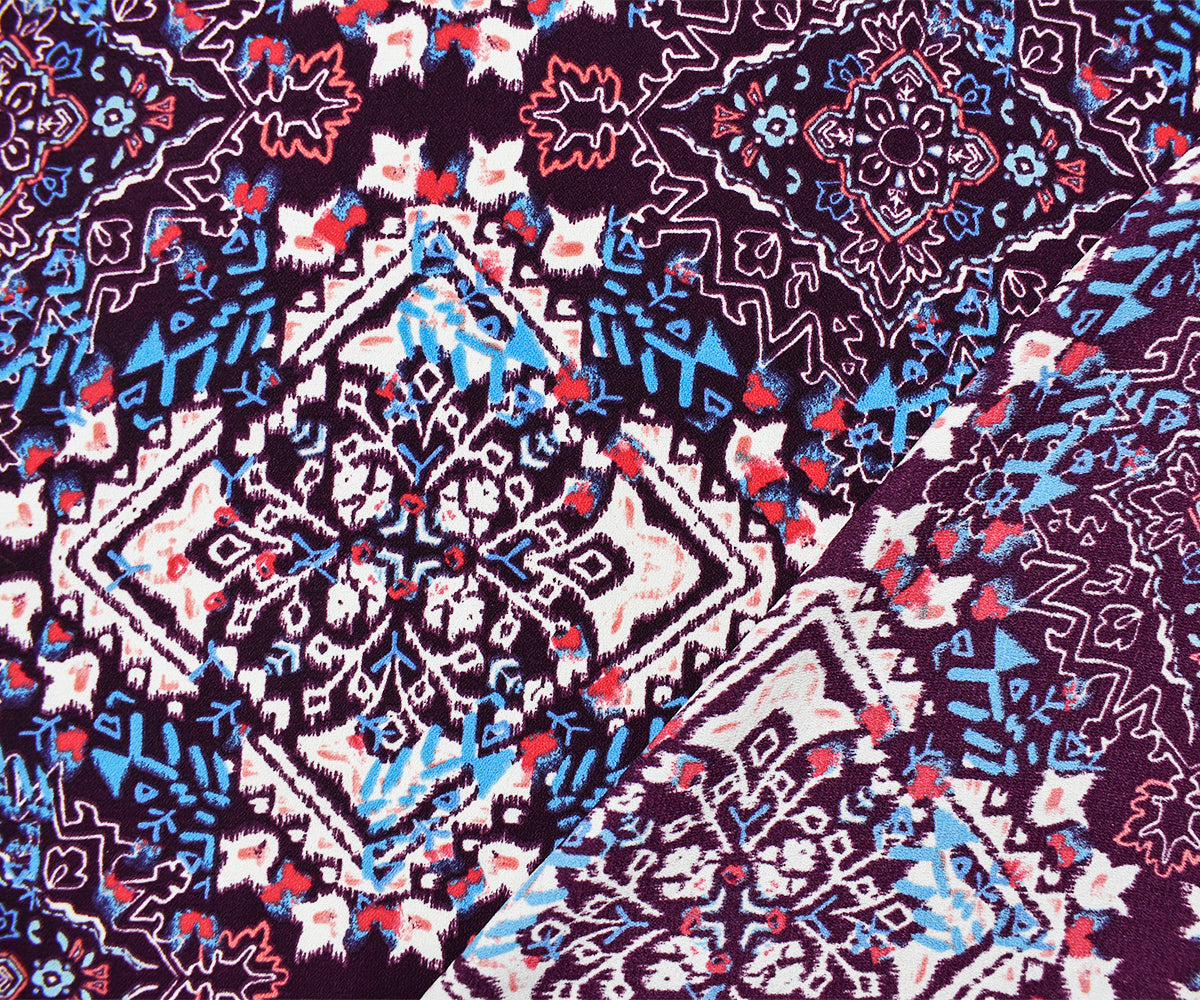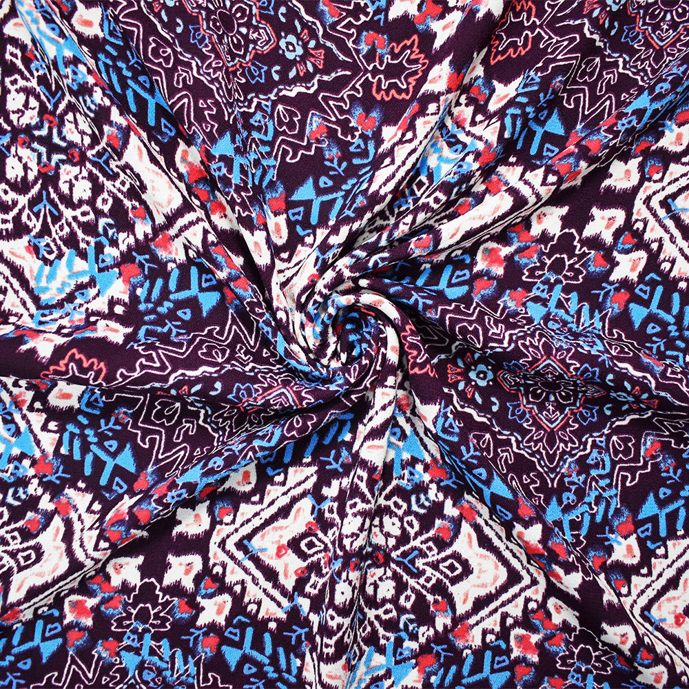Purple-Turquoise-Multi Poly Diamond Aztec Printed Crepe Dobby Woven Fabric