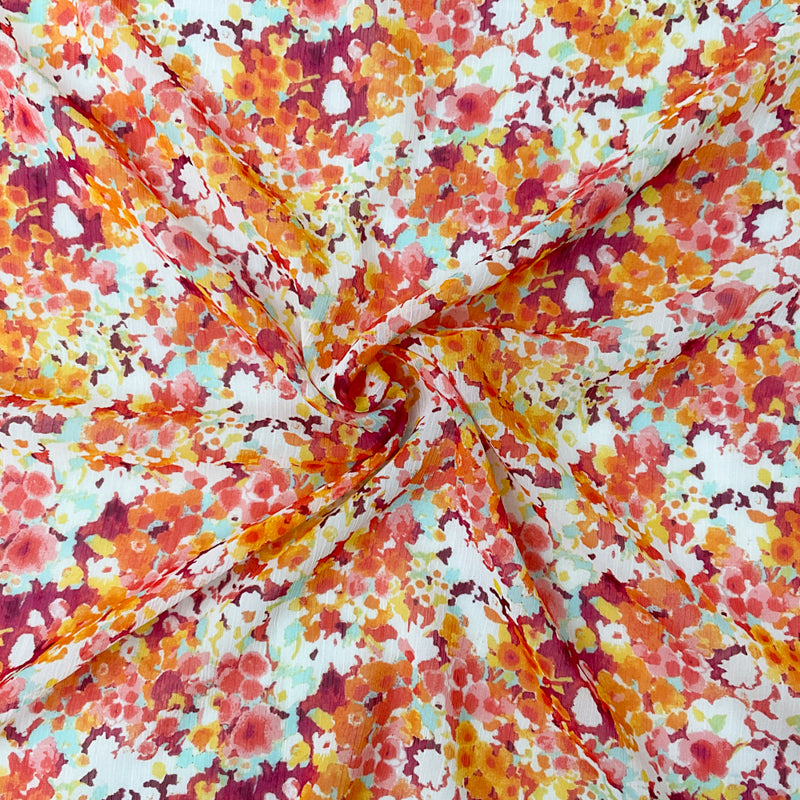 -Red-Yellow-Multi Poly Floral Printed Crinkle Yoryu Chiffon Woven Fabric