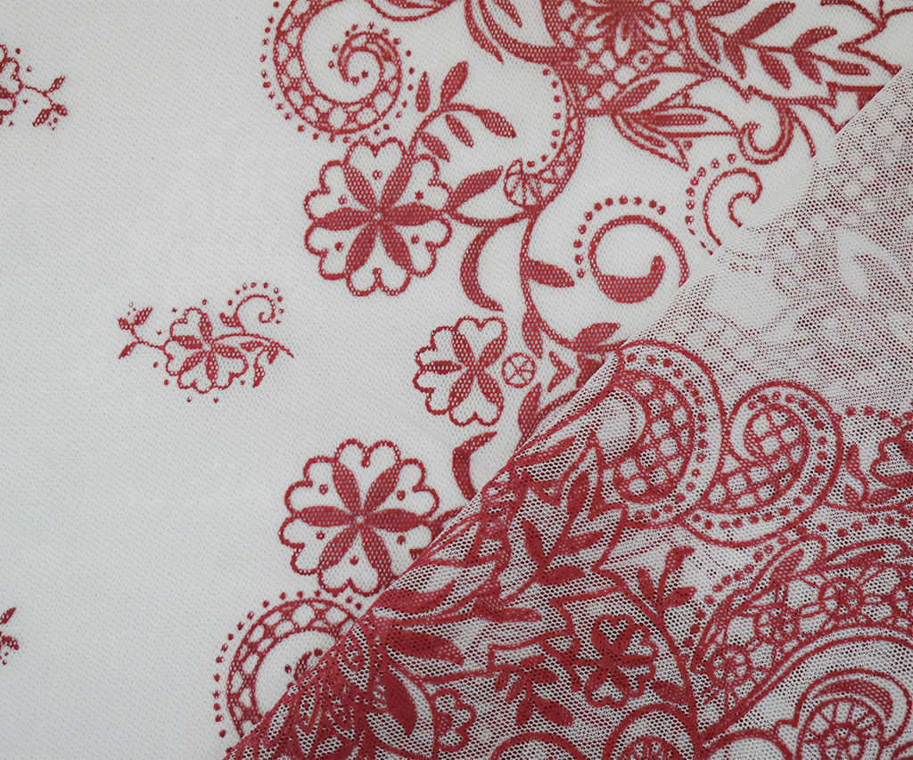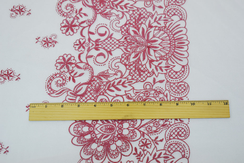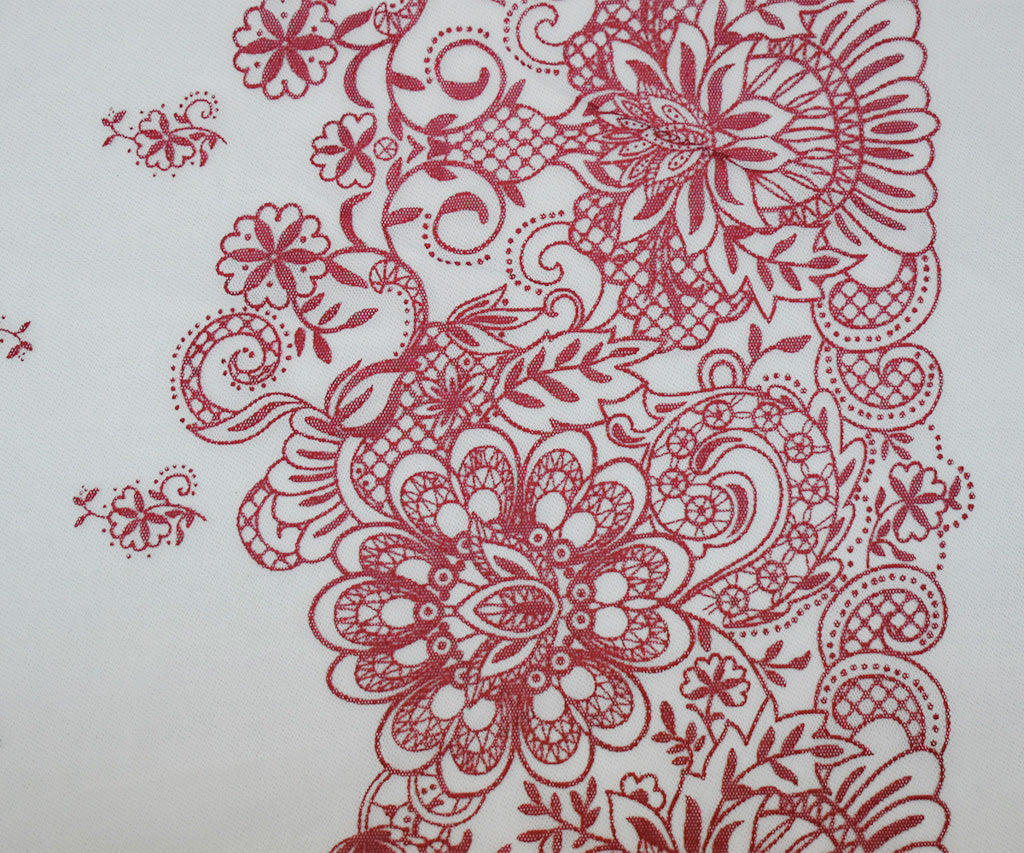 White-Red Nylon Floral Border Printed Mesh Tulle Knit Fabric