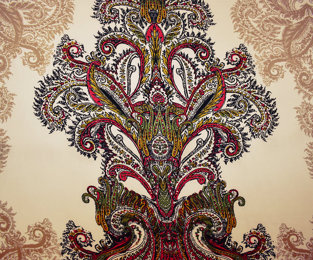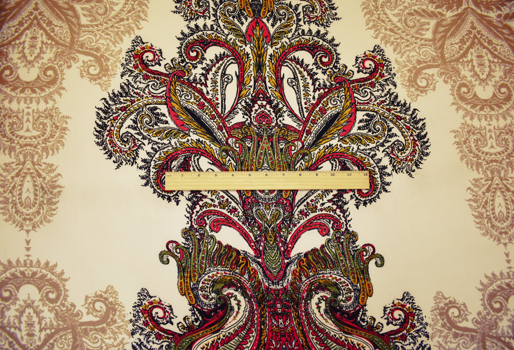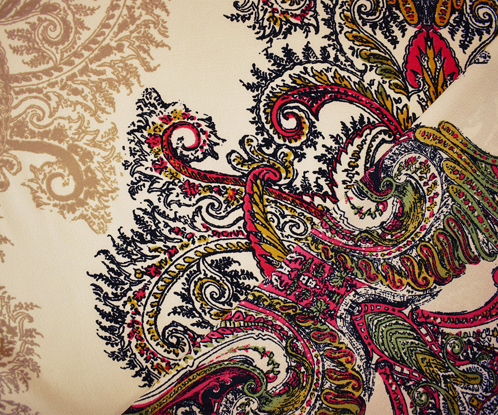 Beige-Red-Multi Poly Paisley Border Printed Pebble Crepe Woven Fabric