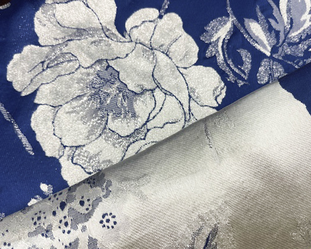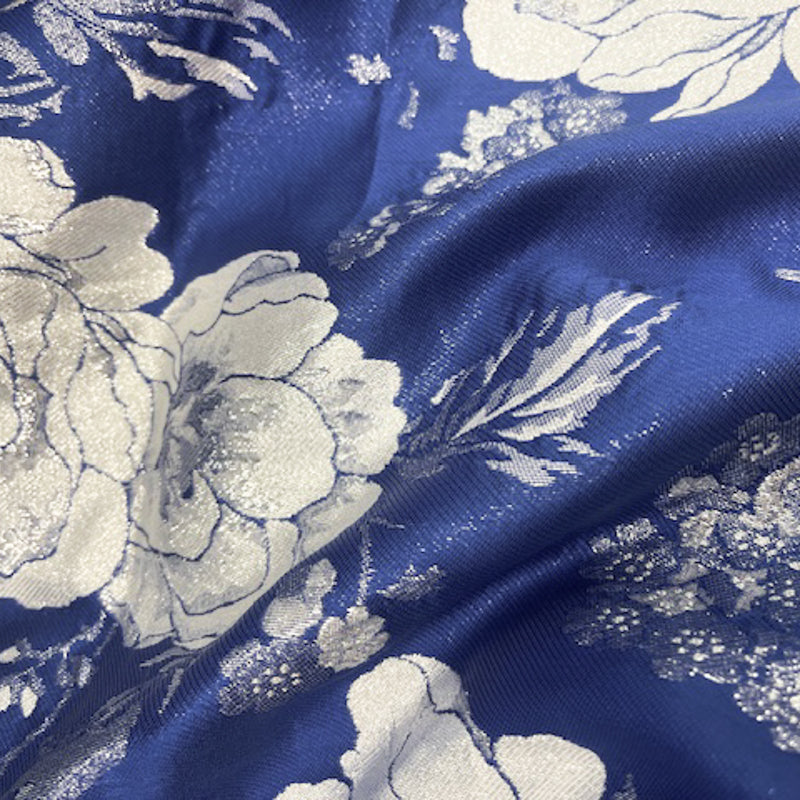 Blue-White-Silver Poly Metallic Floral Double Jacquard Woven Fabric