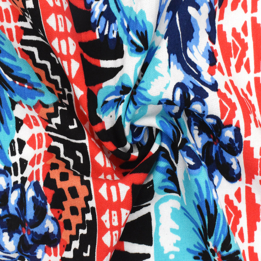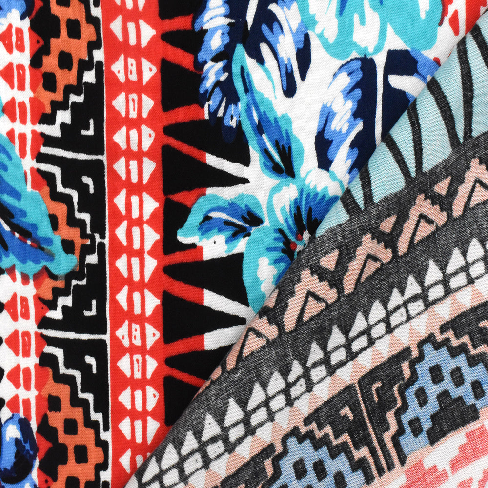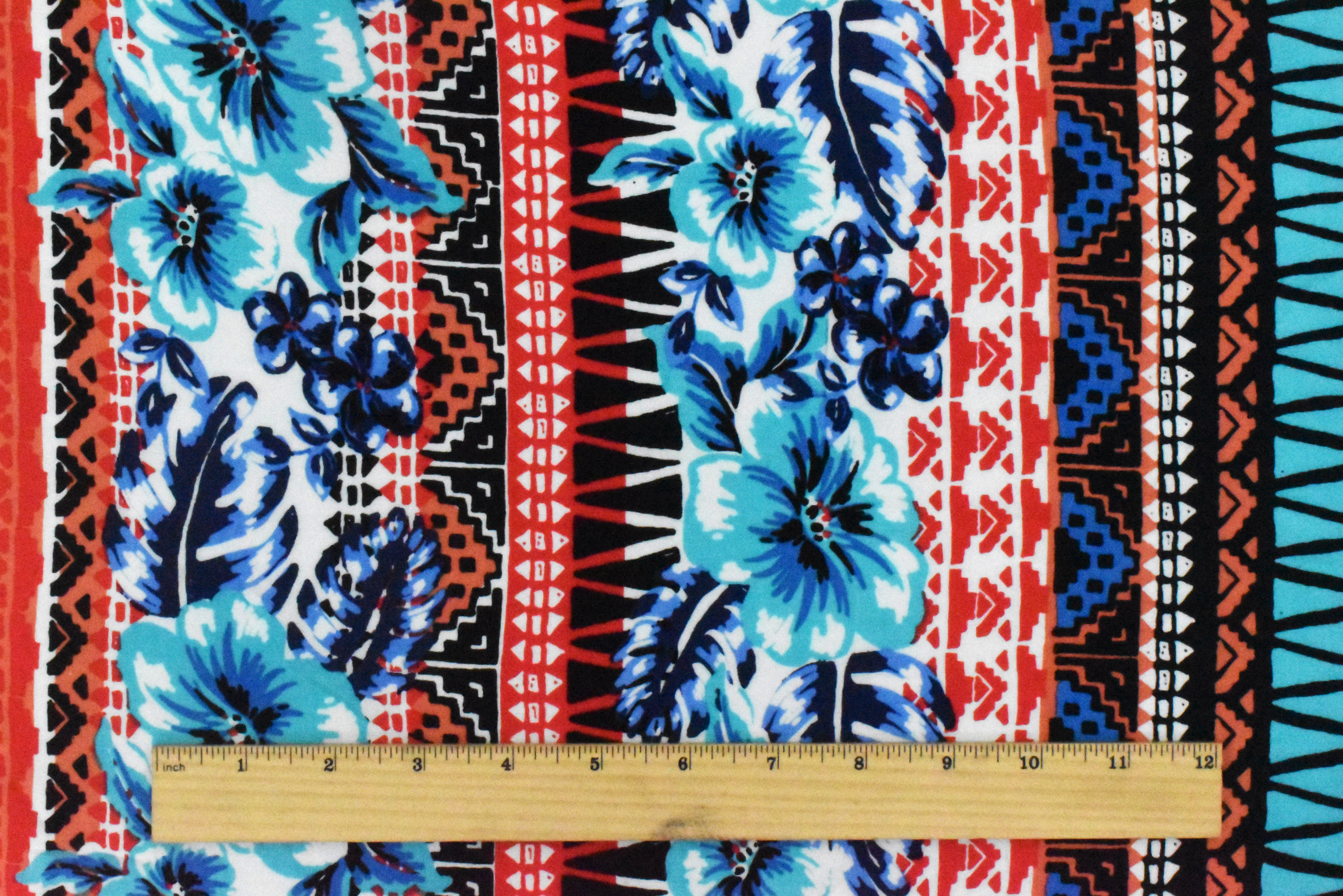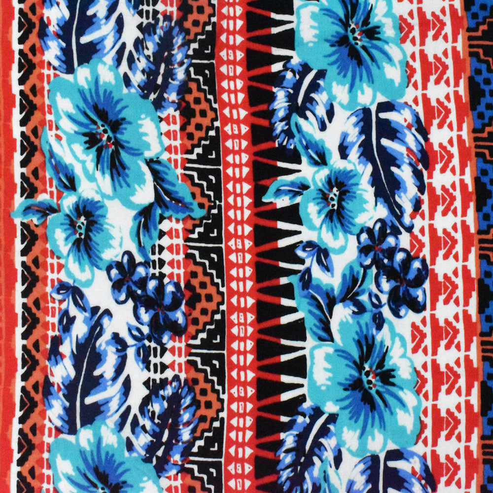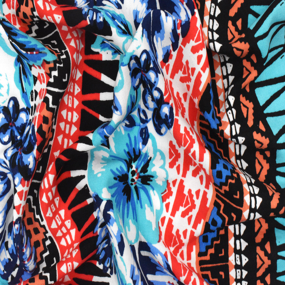 Aqua-Red-Multi Floral Tribal Stripe Printed Challis Fabric