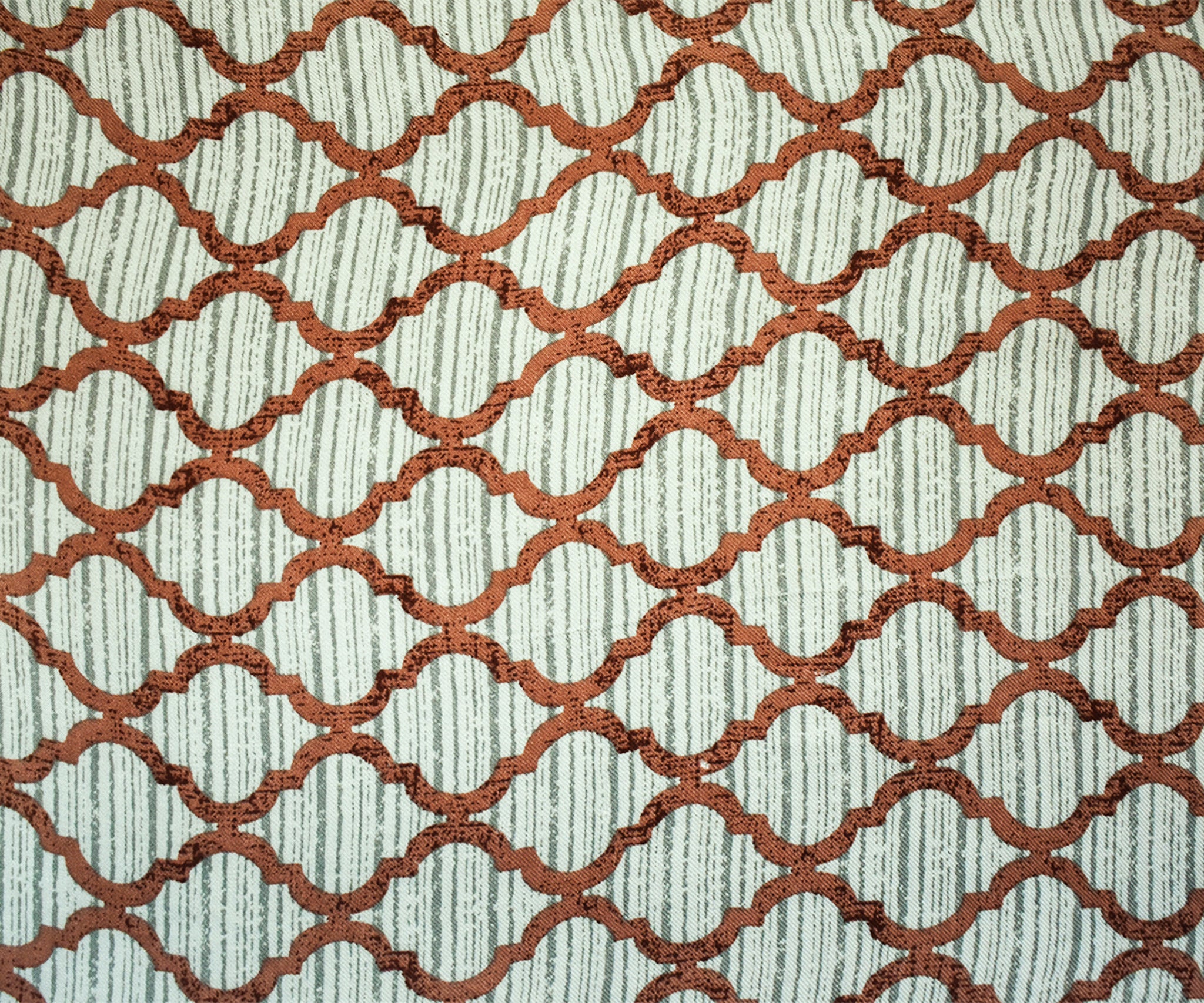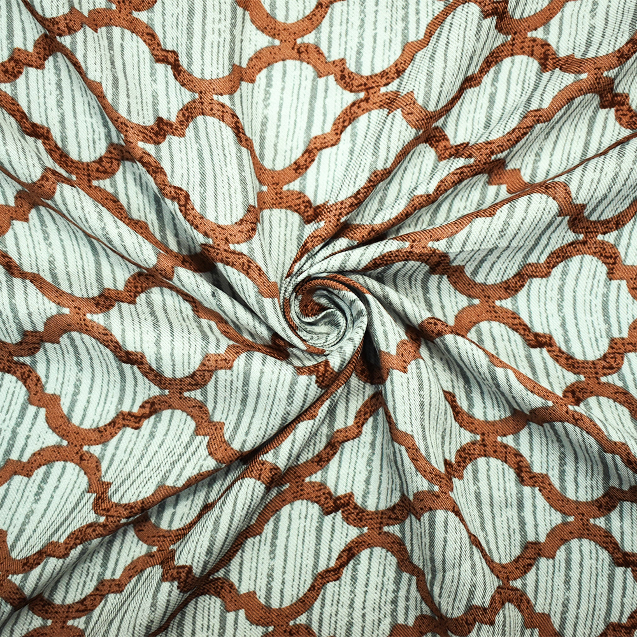 -100% Rayon twill woven fabric printed with a bordered stylized pattern featuring ogee,and pillar design elements.