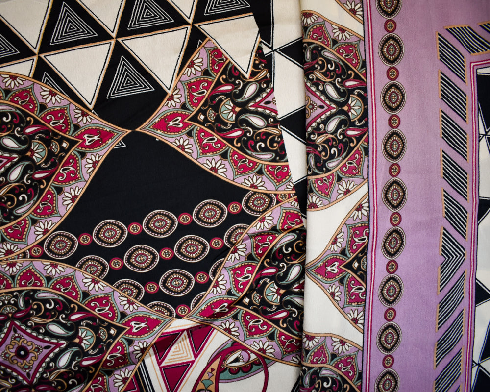 Purple-Beige-Multi Polyester Multi Pattern Border Printed Charmeuse Woven Fabric