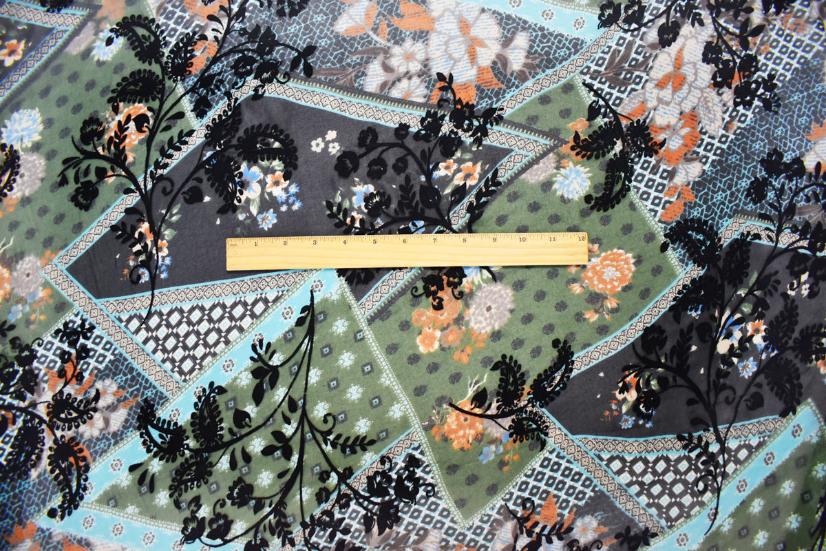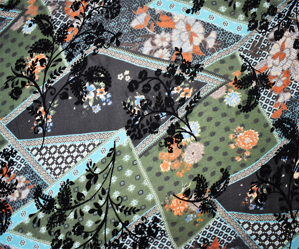 Green-Multi Poly Patch Floral Velvet Flocked Chiffon Woven Fabric