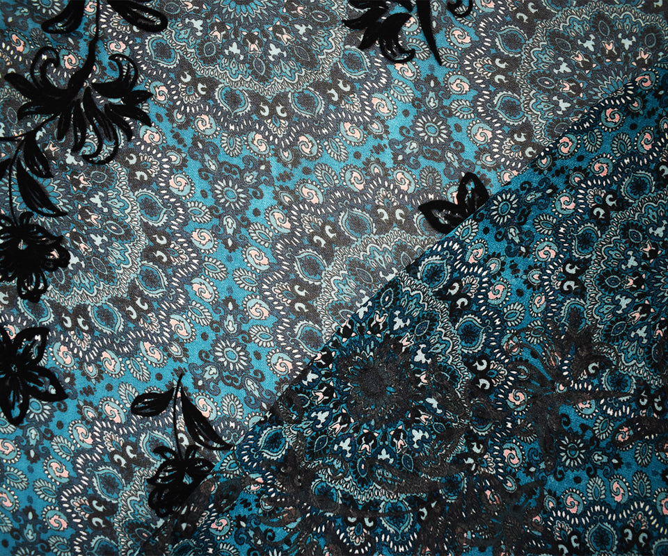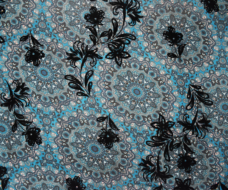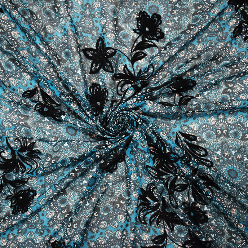 Teal-Multi Poly Moroccan Floral Velvet Flock Chiffon Woven Fabric