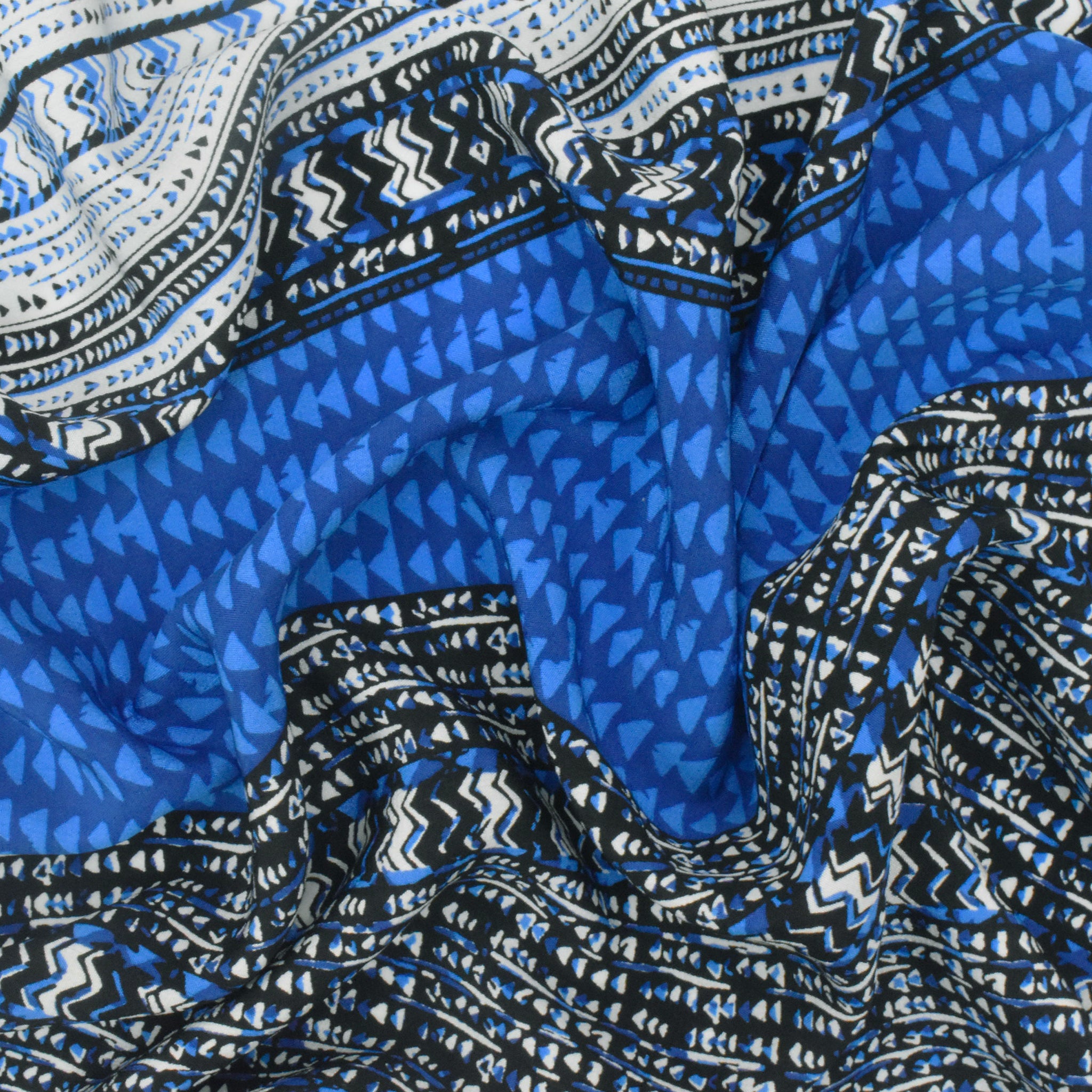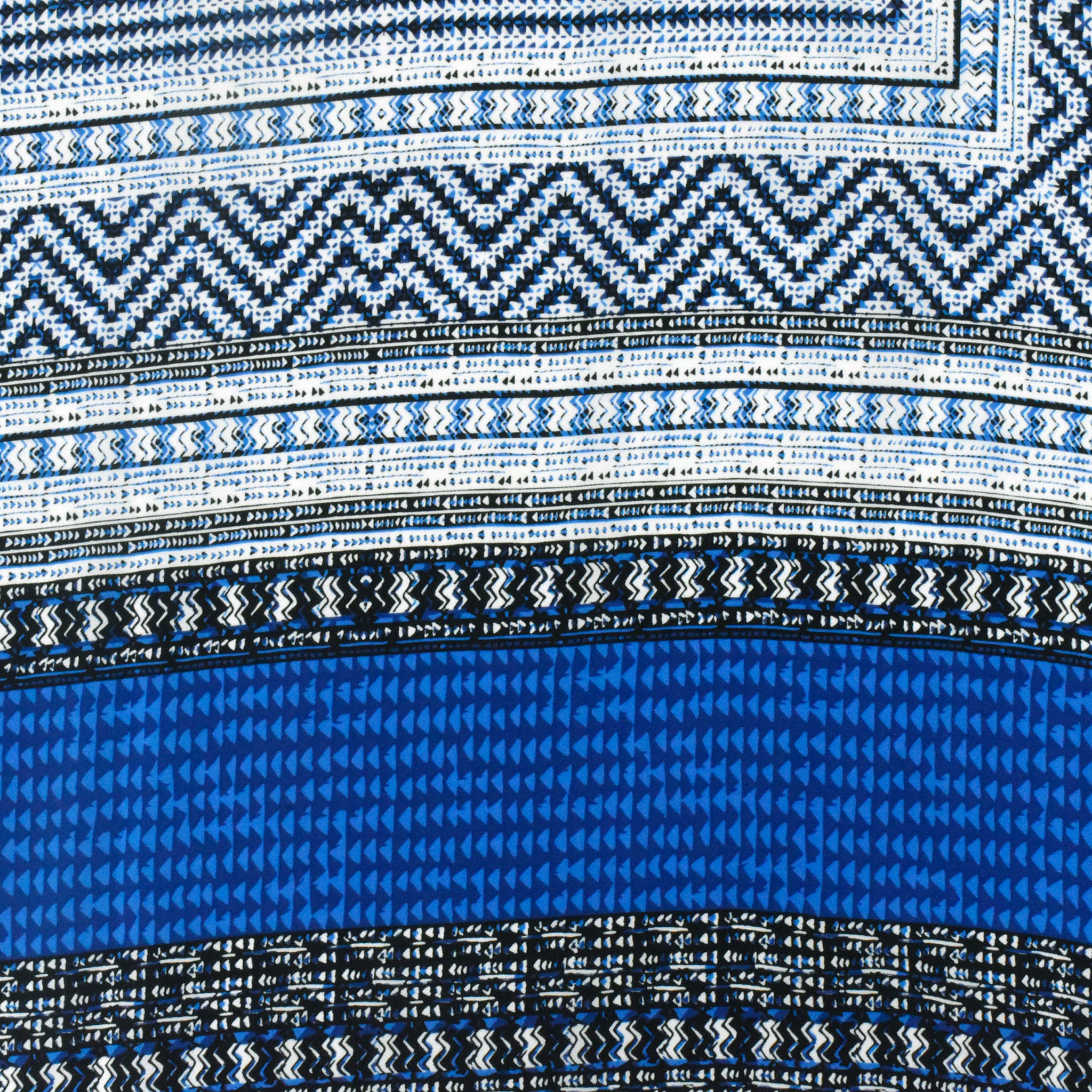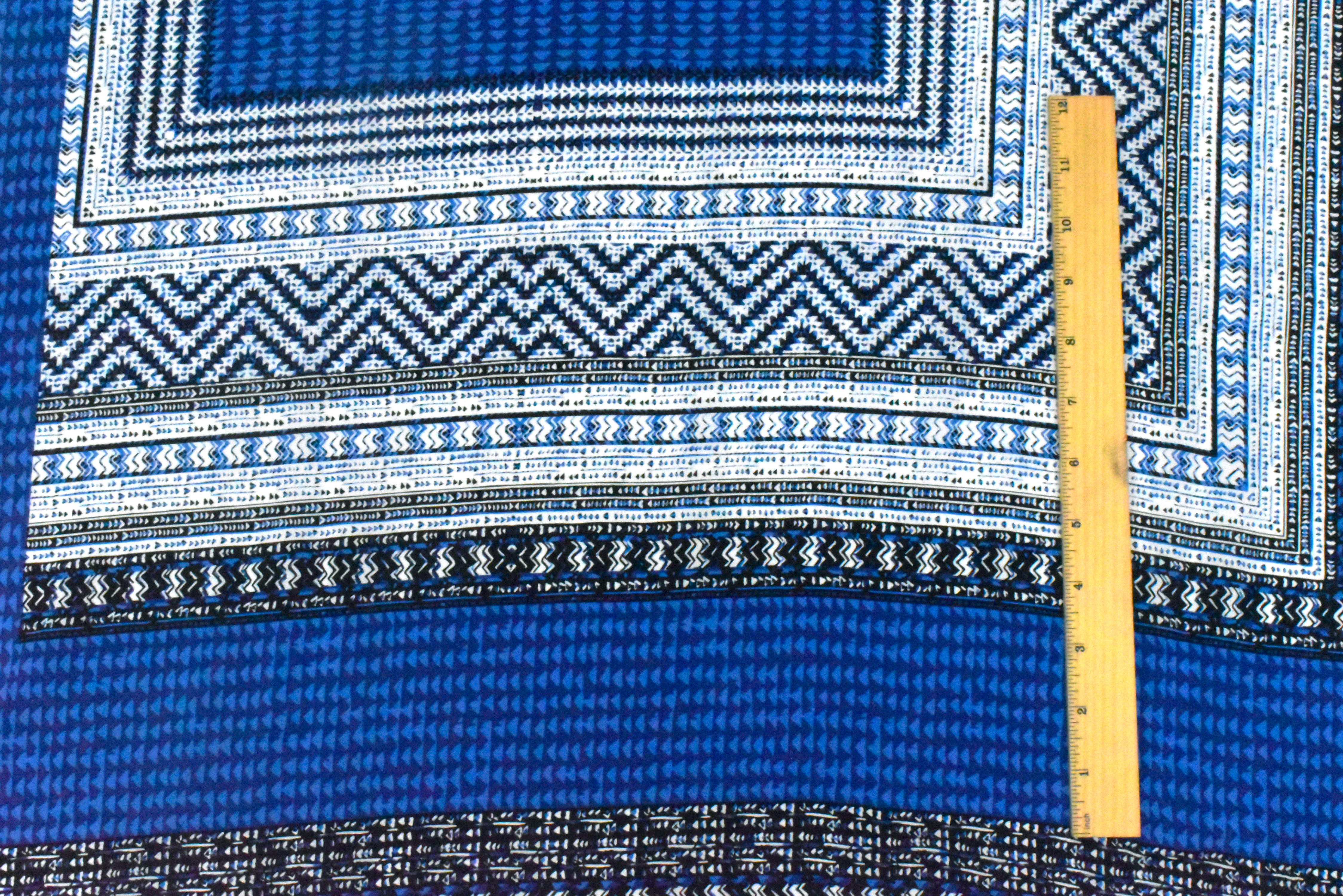Ocean Blue-White-Multi Aztec Panel Border Printed China Silk Woven Fabric