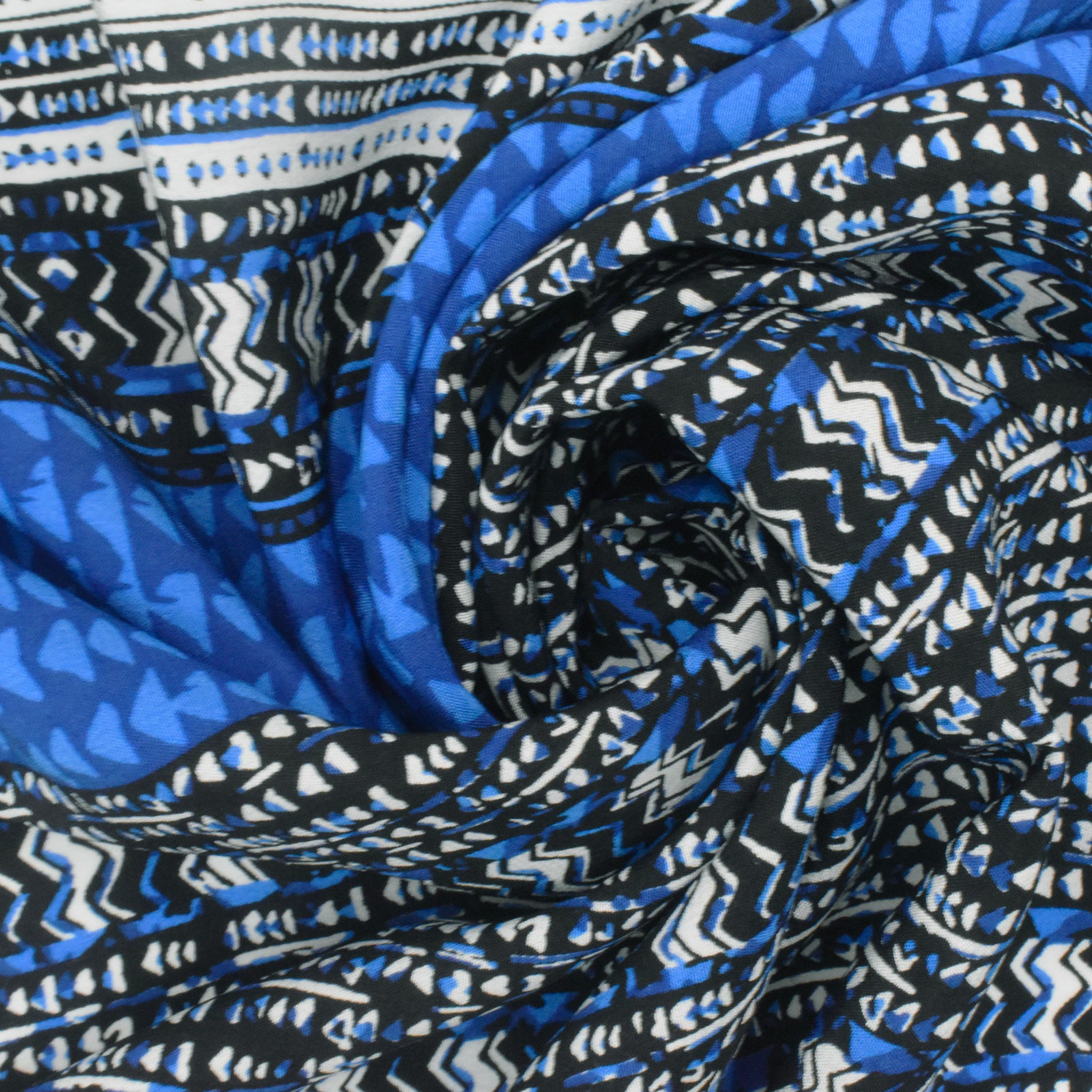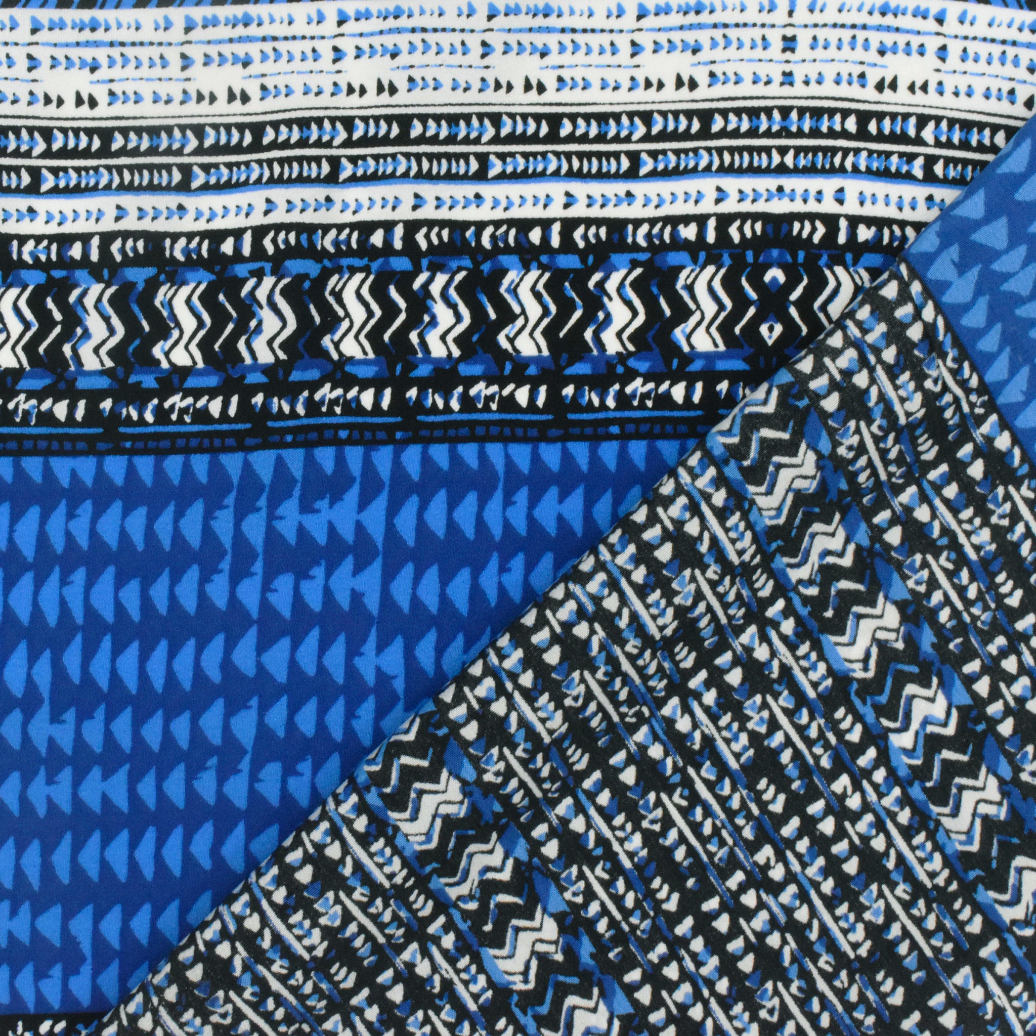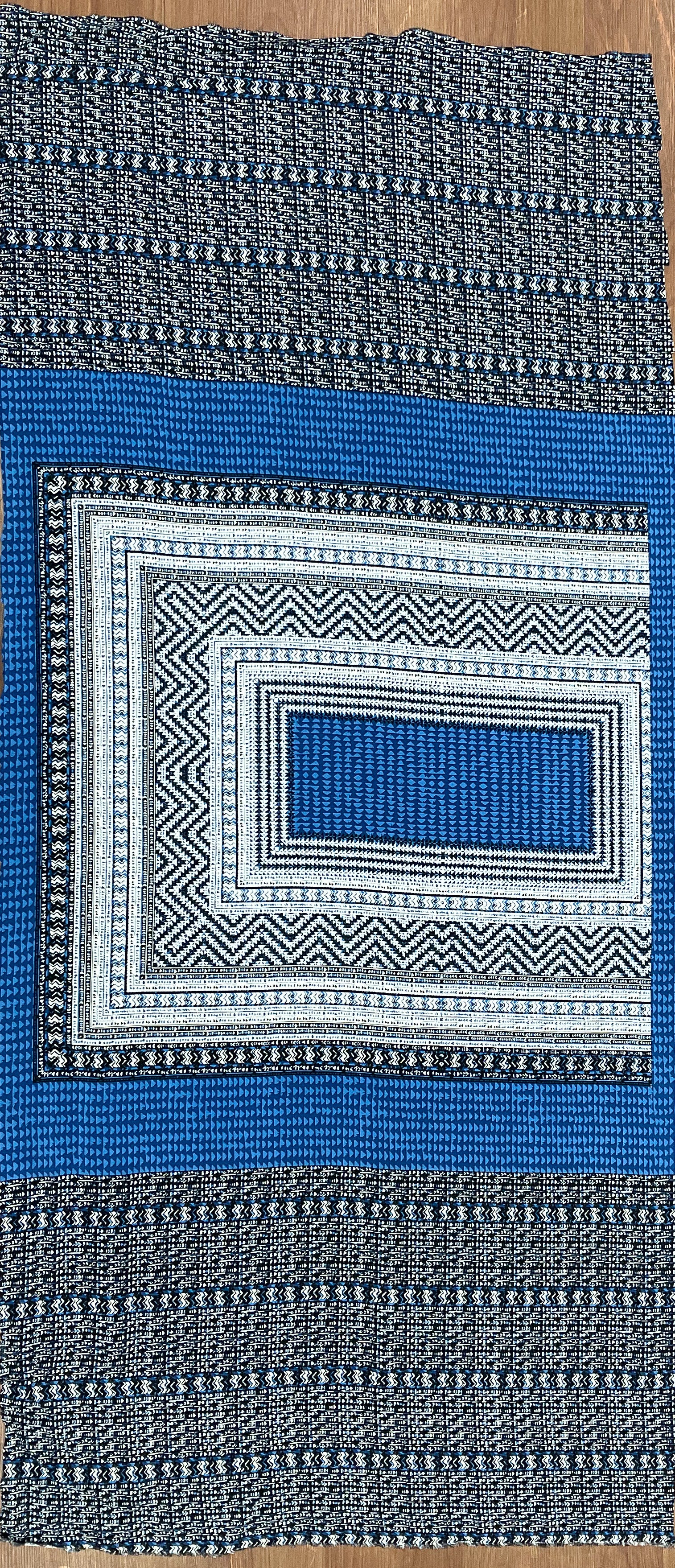 Ocean Blue-White-Multi Aztec Panel Border Printed China Silk Woven Fabric