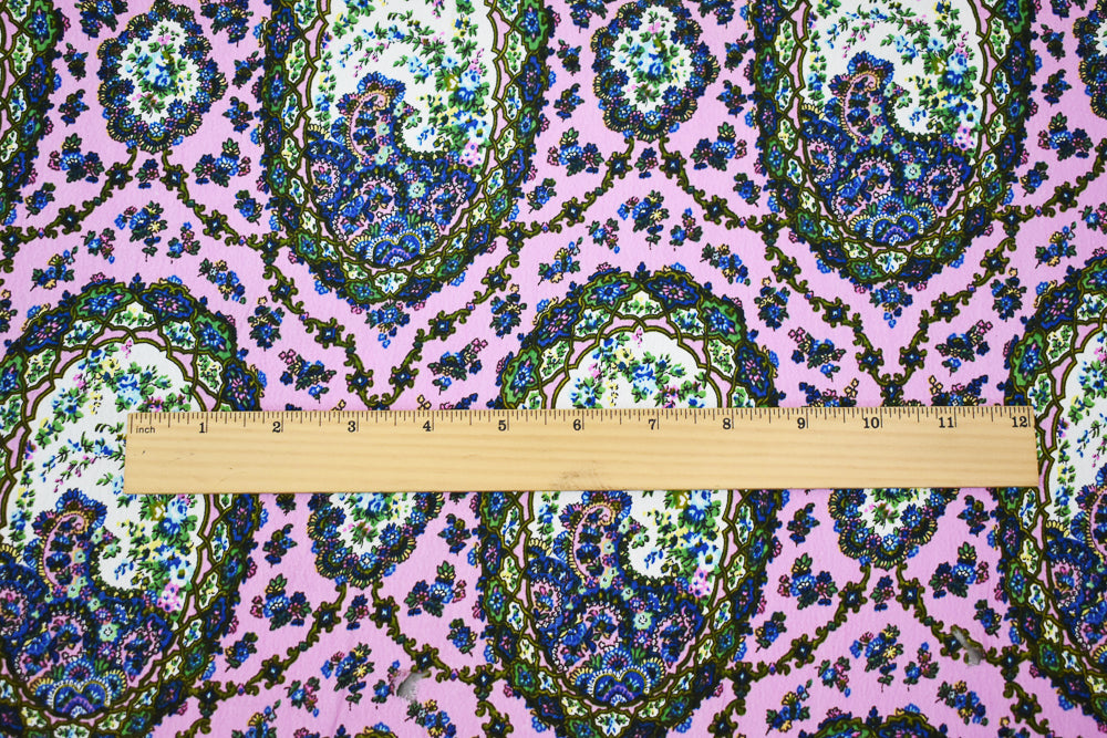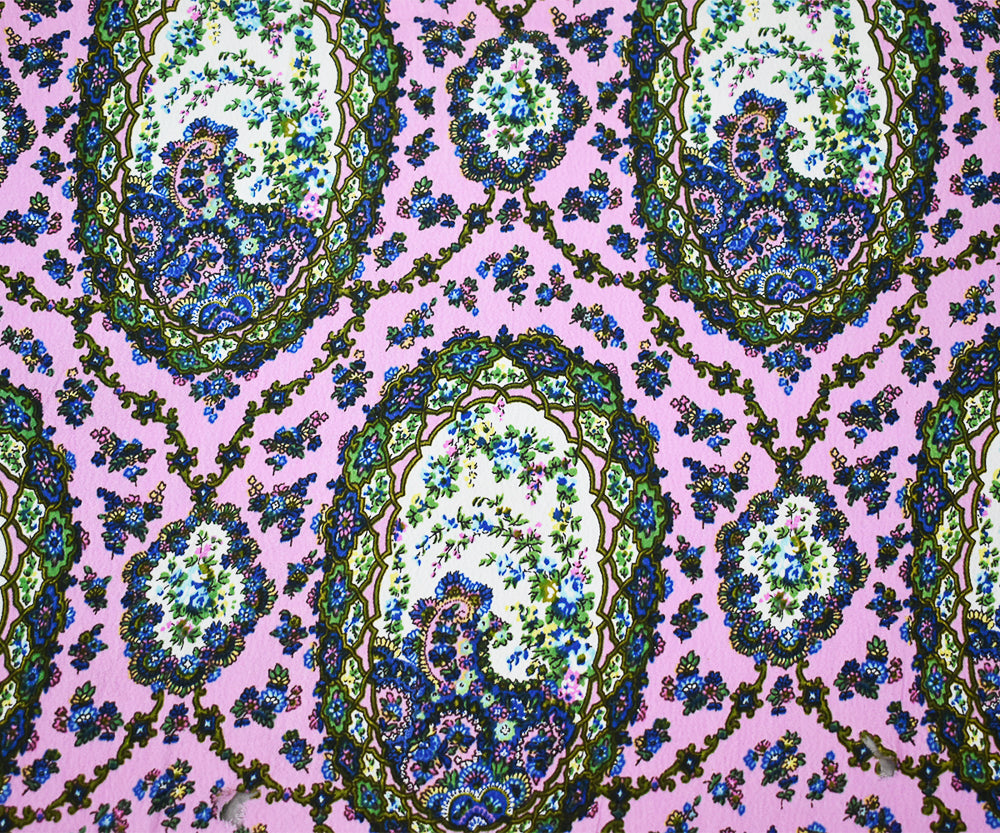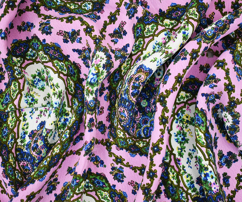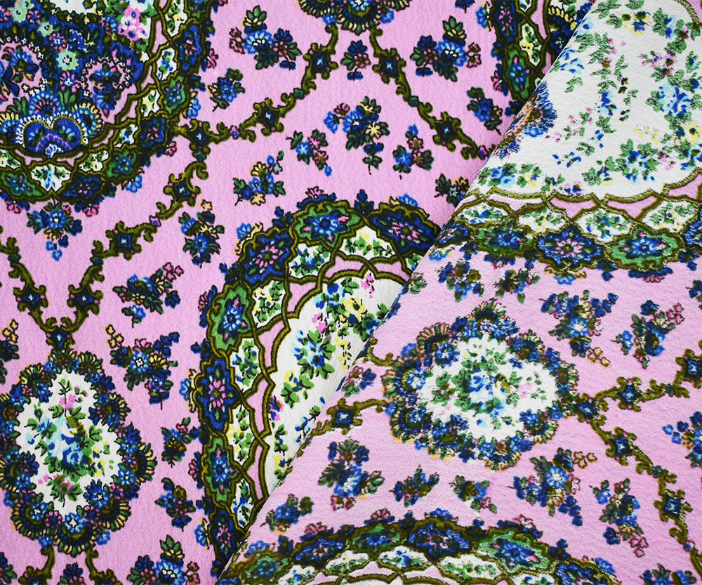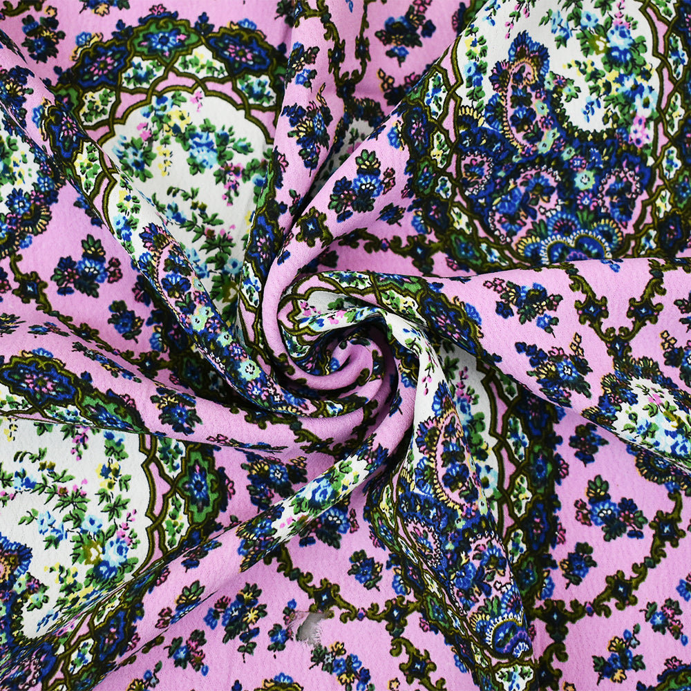 Pink-Blue-Multi Floral Frame Trellis Printed Rayon Crepe Faille Woven Fabric