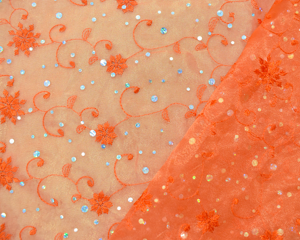 Orange-Silver Poly Metallic Floral Embroidery Scallop Organza Woven Fabric