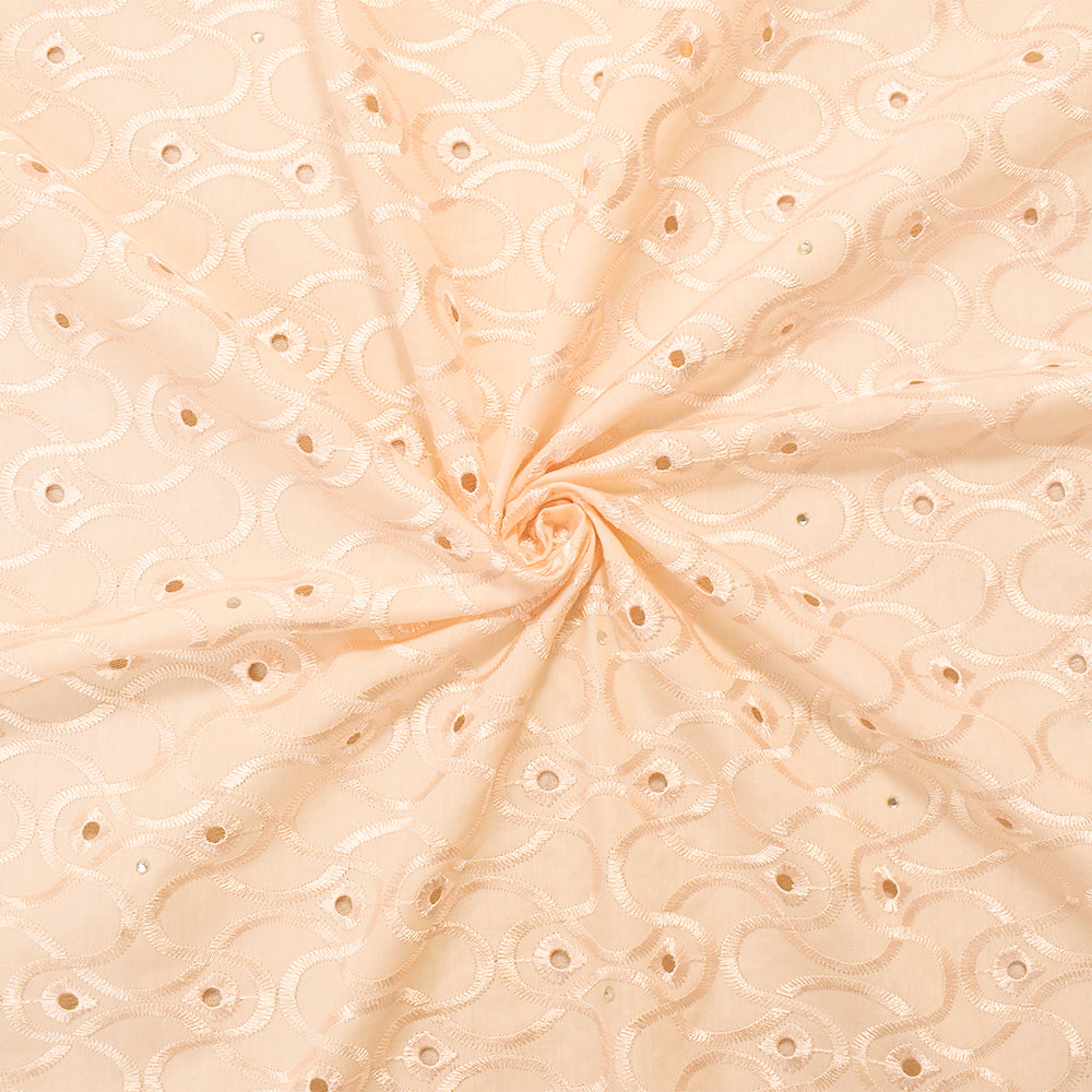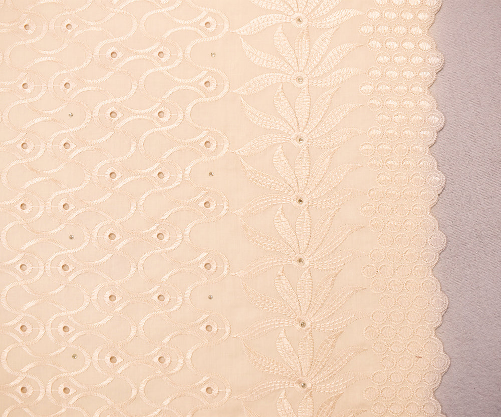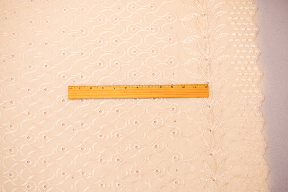 Beige Poly-Cotton Embroidery Eyelet Floral Scallop Rhinestone Woven Fabric