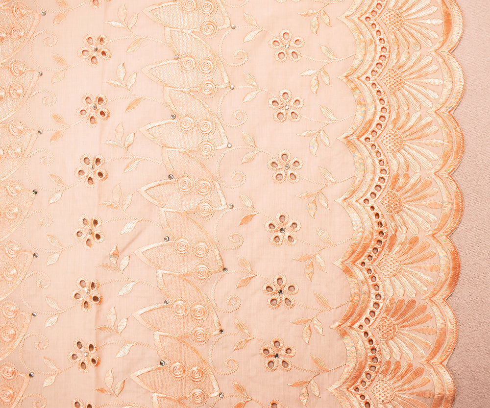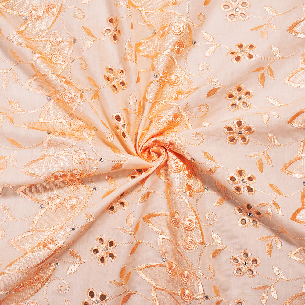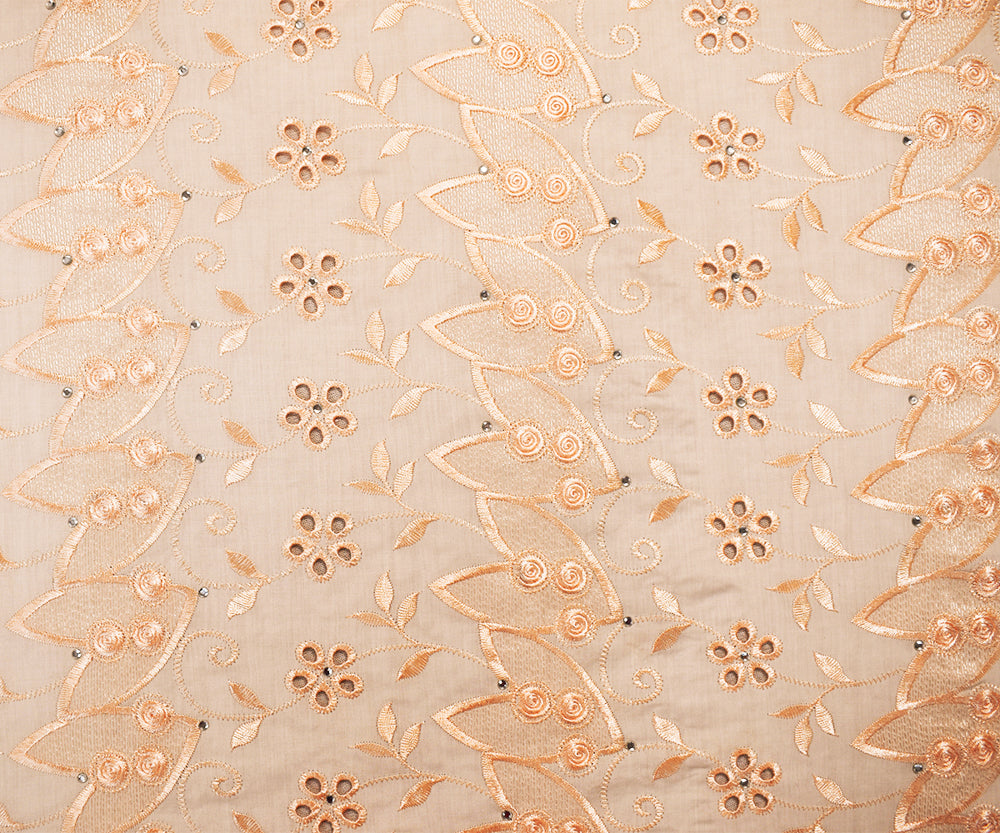 Warm Beige Poly-Cotton Floral Vine Eyelet Scalloped Rhinestone Woven Fabric