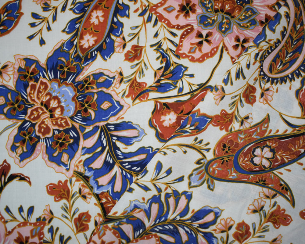 Blue-Orange-Multi Cotton-Rayon Floral Printed Lawn Woven Fabric