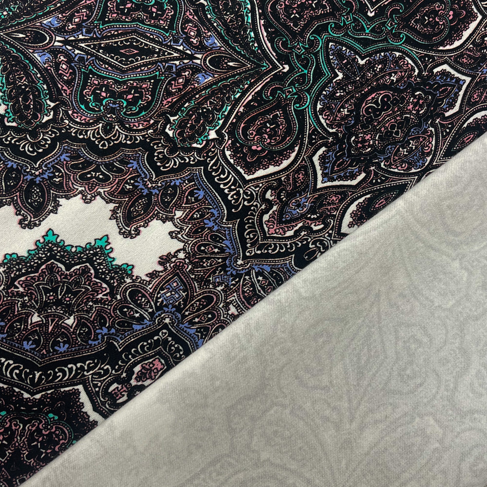 -Cotton stretch spandex sateen woven fabric printed with an intricate baroque pattern. Made in Italy.