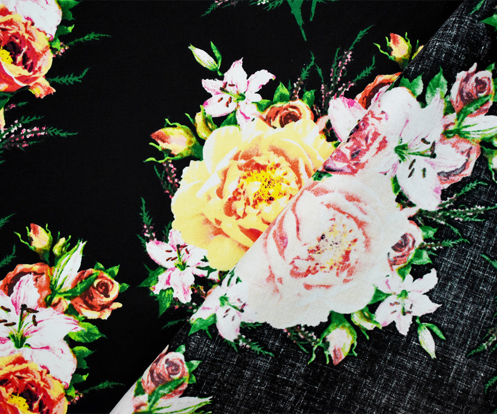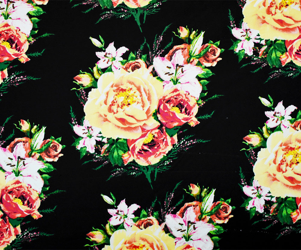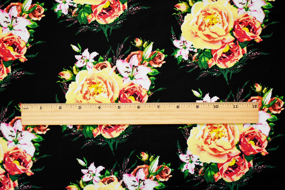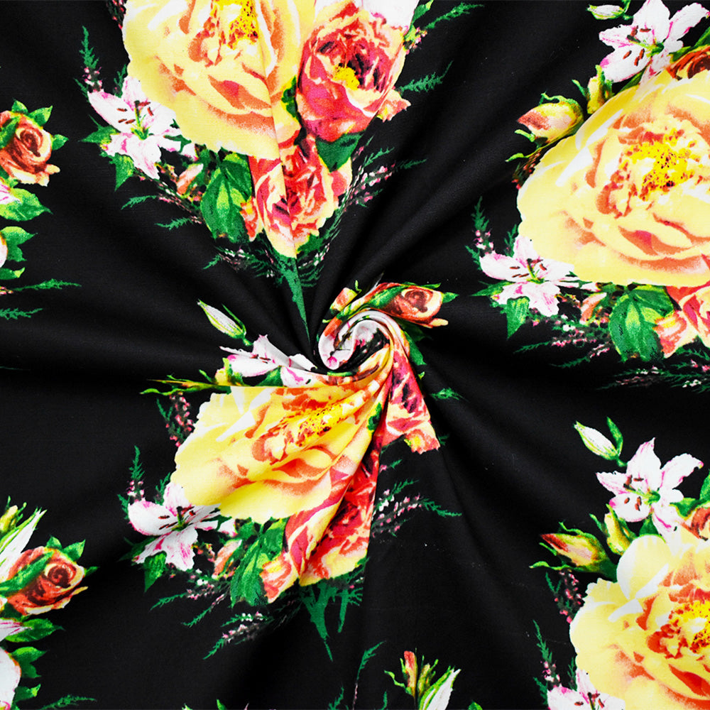 Black-Yellow-Multi Floral Printed Stretch Spandex Poplin Woven Fabric
