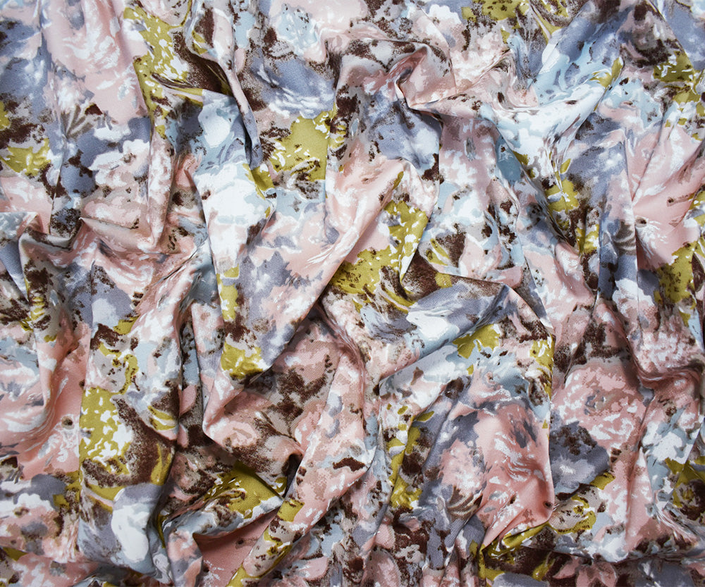 -Cotton stretch spandex twill sateen-like woven fabric printed with an abstract floral pattern. Made in Korea.
