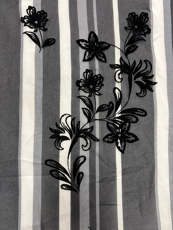 Black Flocked Floral Burnout Stripe Print High Crepe Fabric