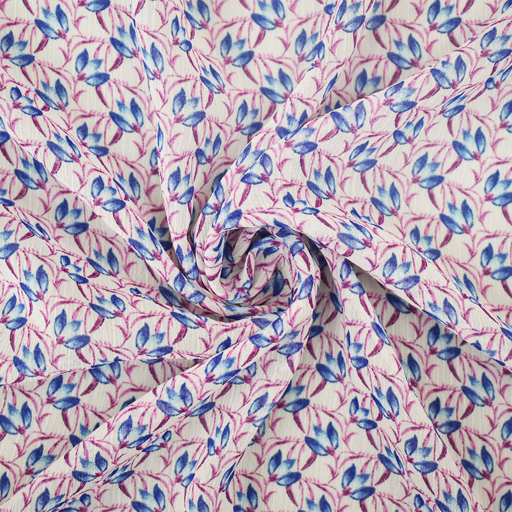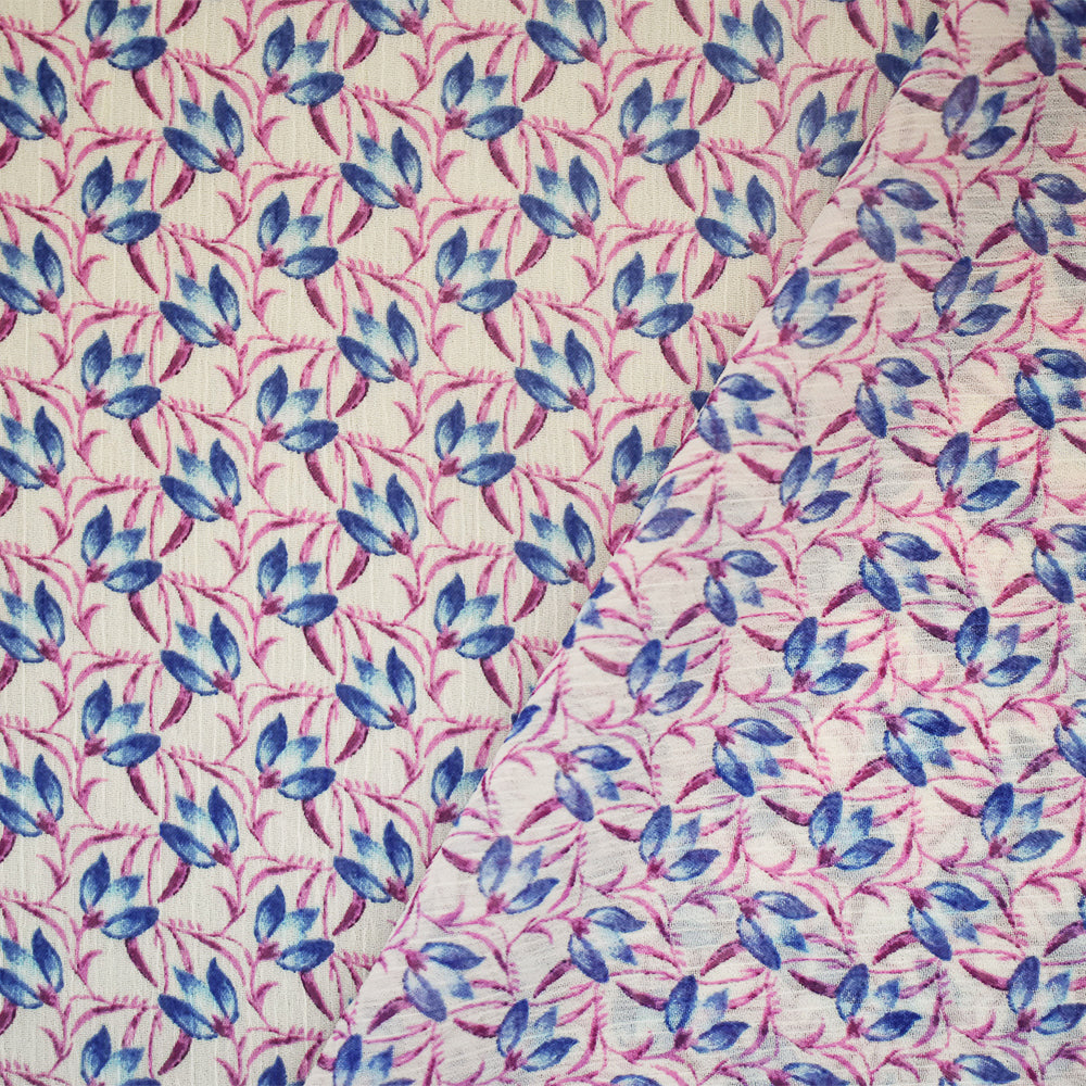 Ivory-Purple-Blue Floral Printed Poly Yoryu Chiffon Woven Fabric