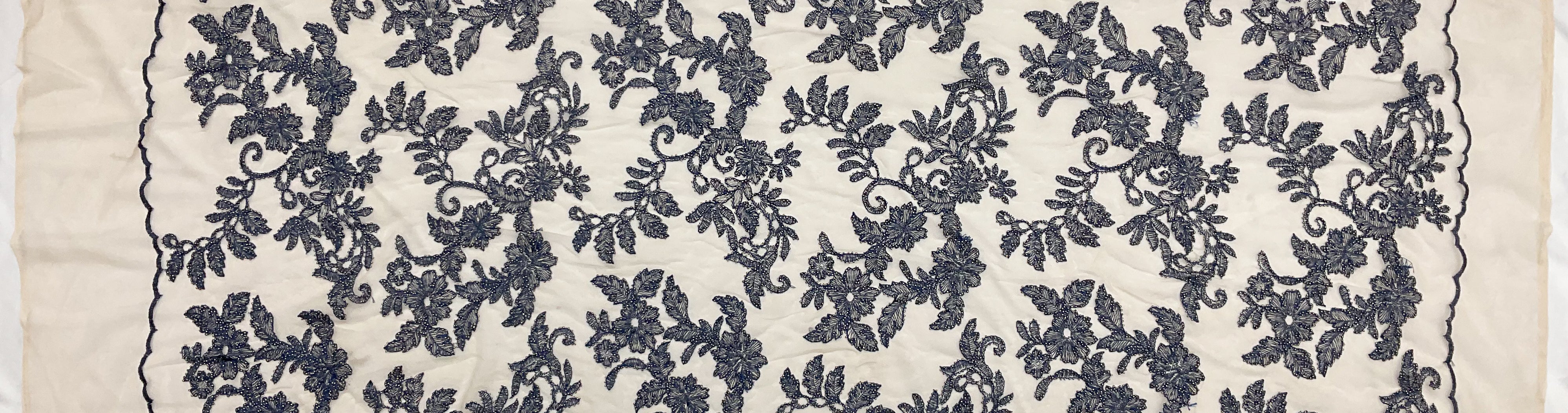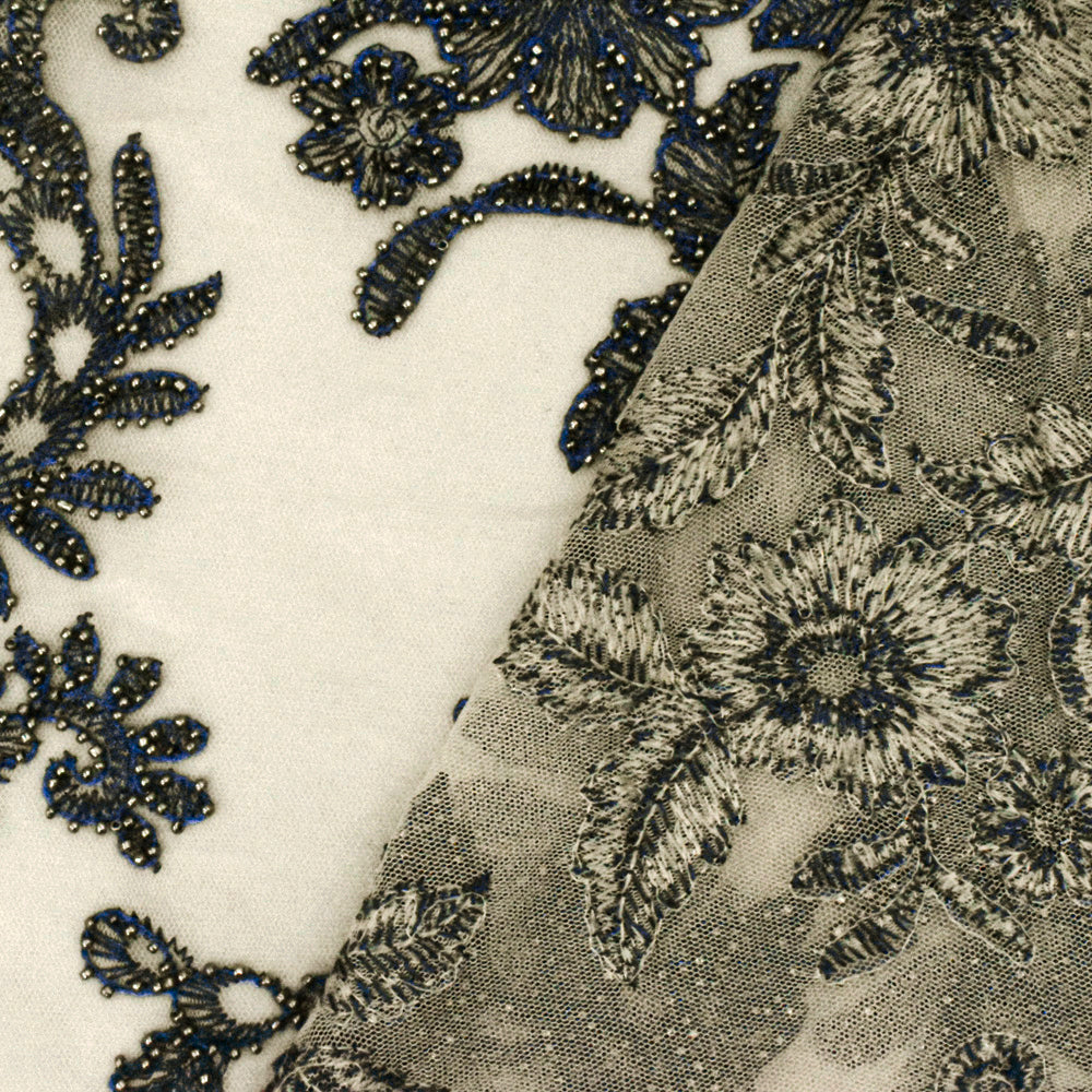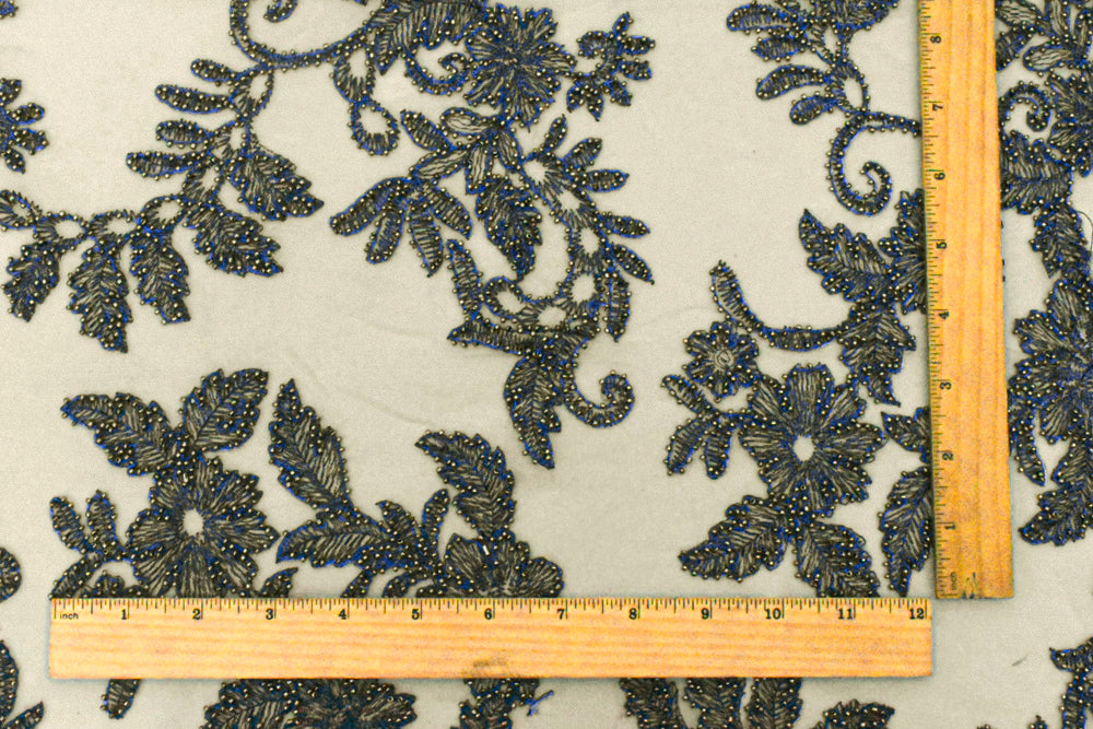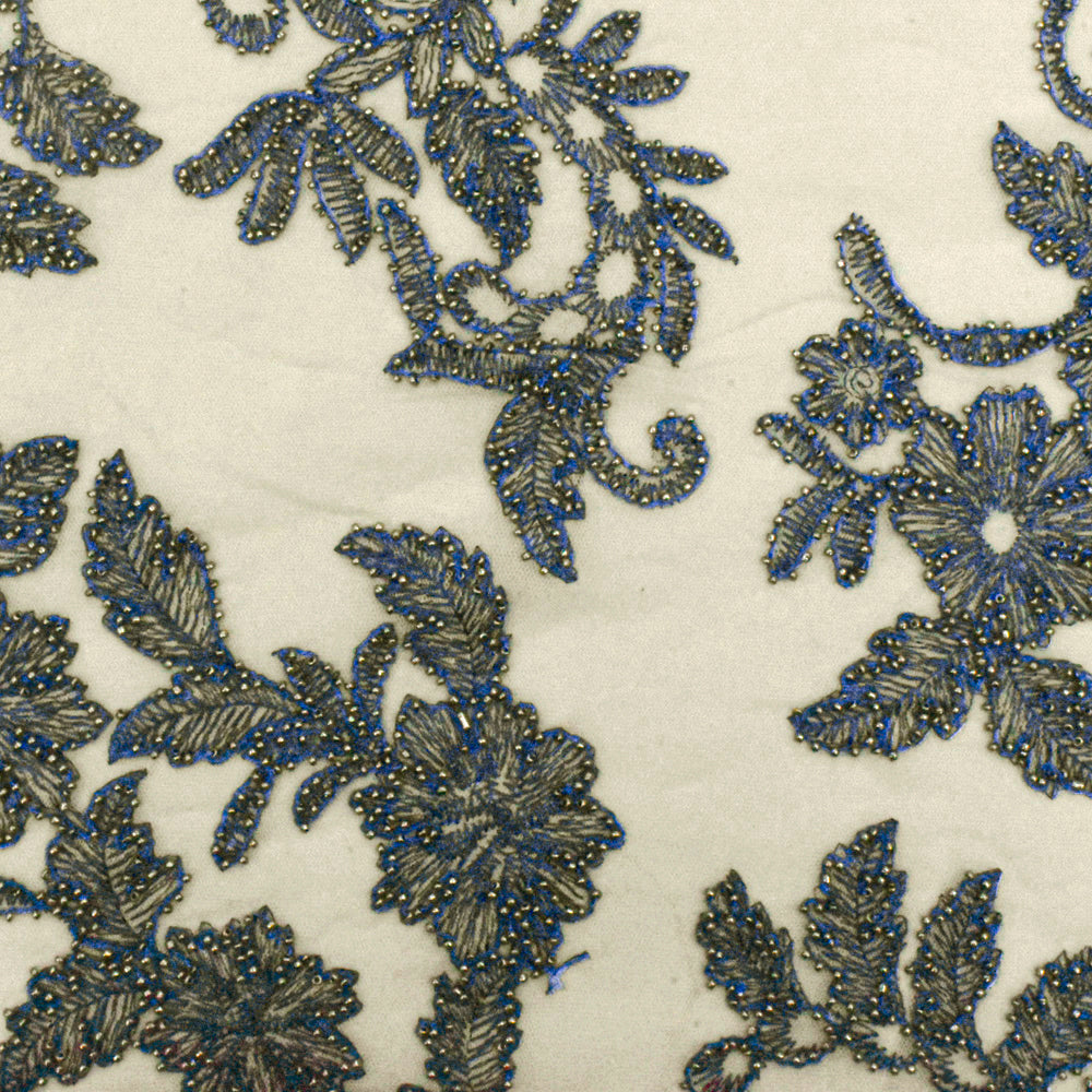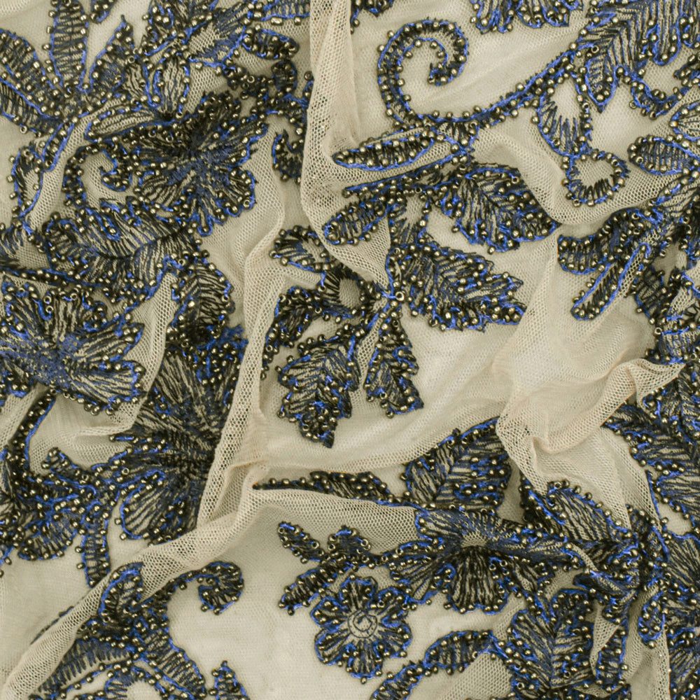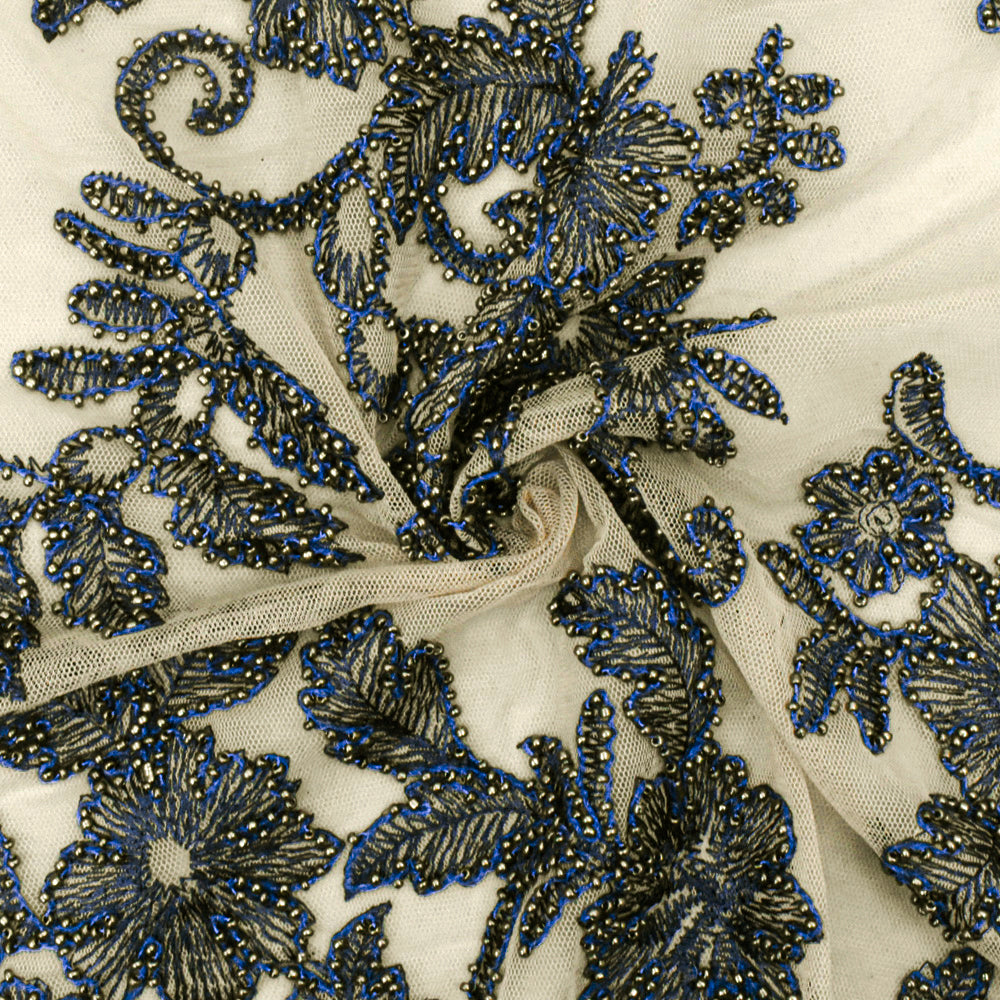 Beige-Blue-Silver Floral Bead Embroidered Scallop Tulle Fabric