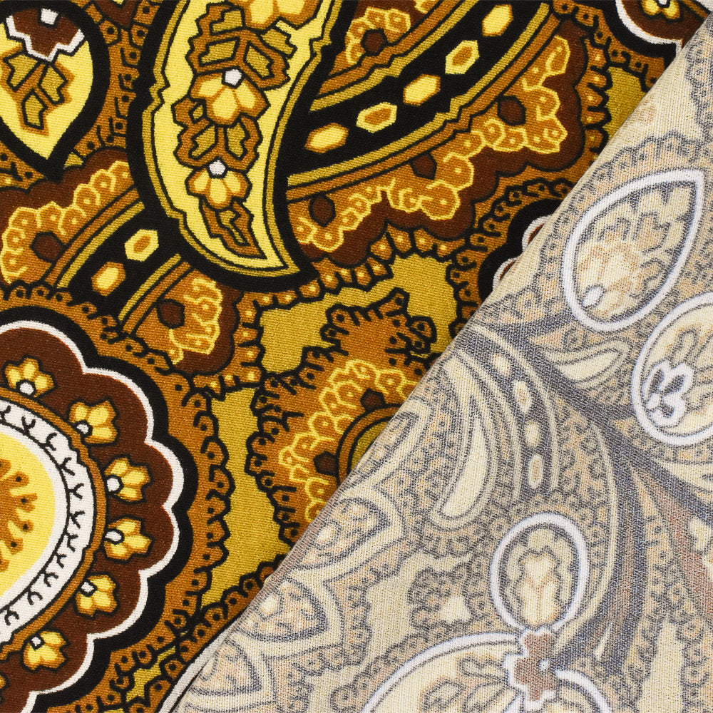 -100% Viscose famous designer crepe faille fabric printed with a stylized paisley pattern, line if needed. Made in Italy.