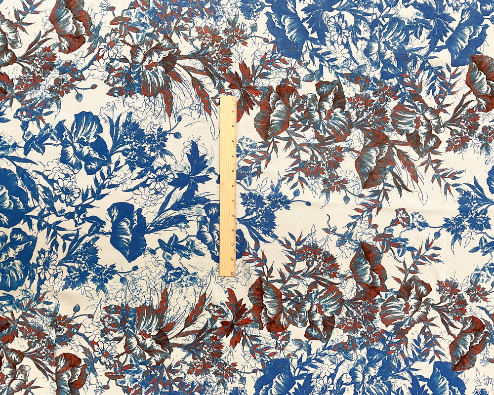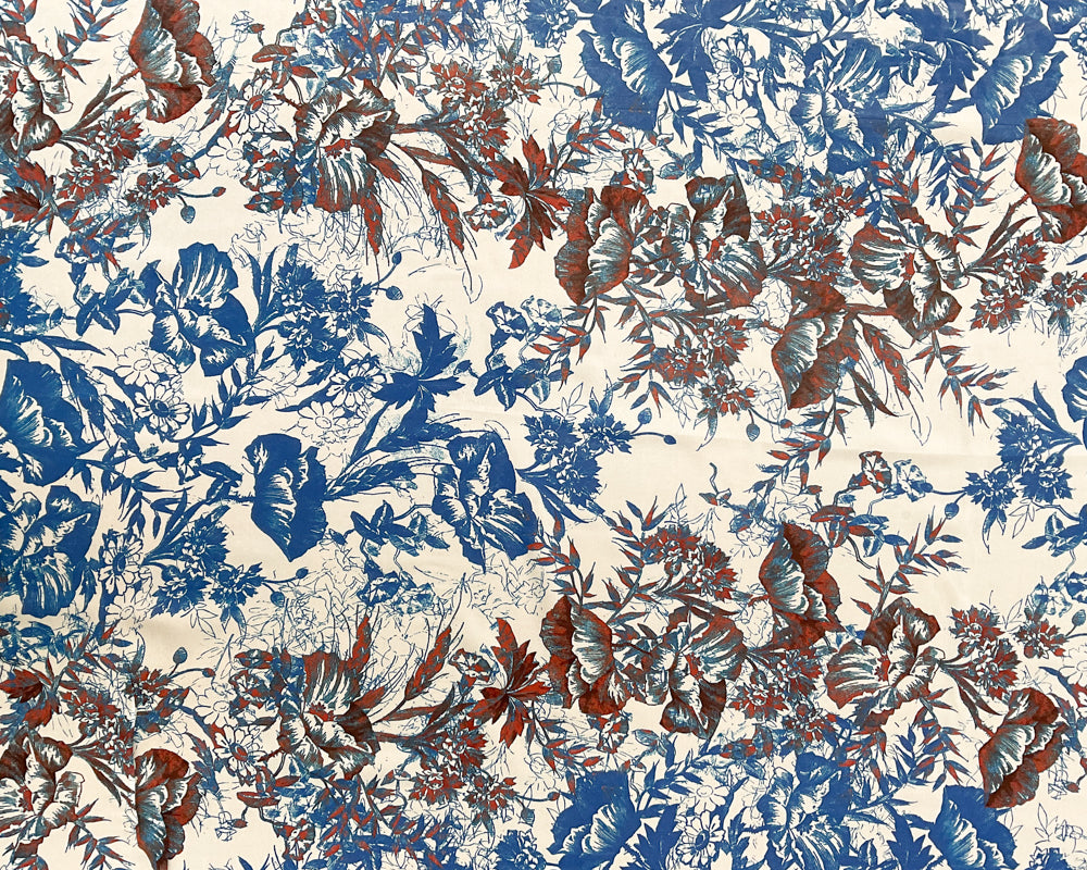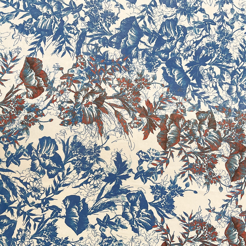 5 1/4 YD PC-Blue-Rust-Ivory Floral Silk Designer Remnant Fabric