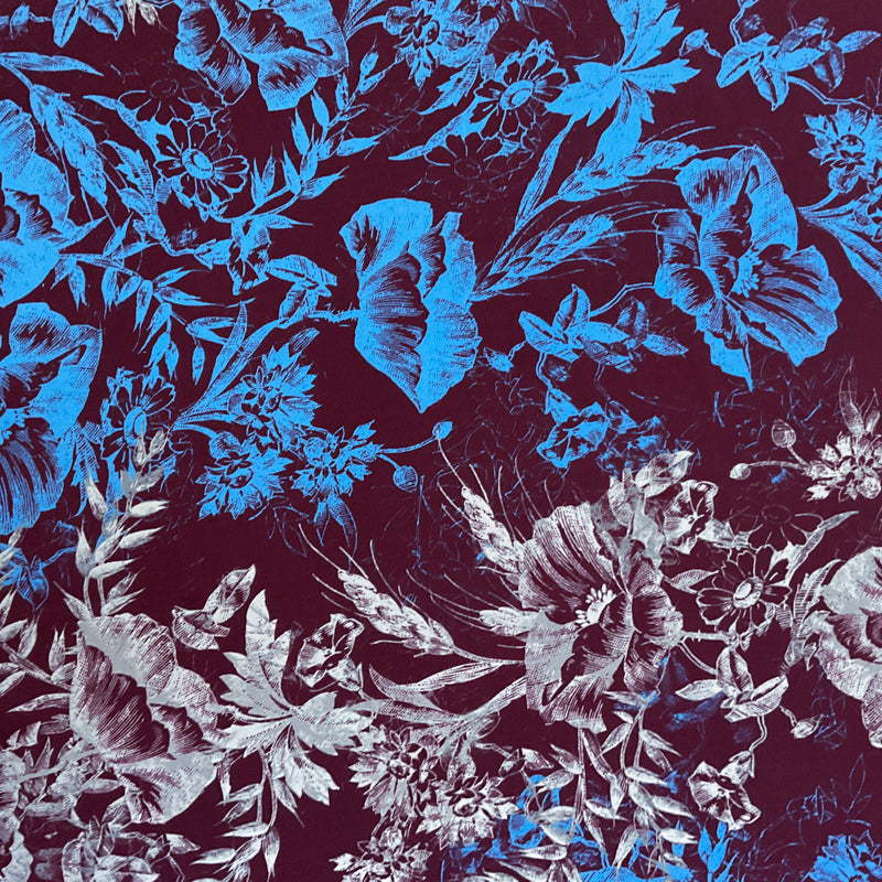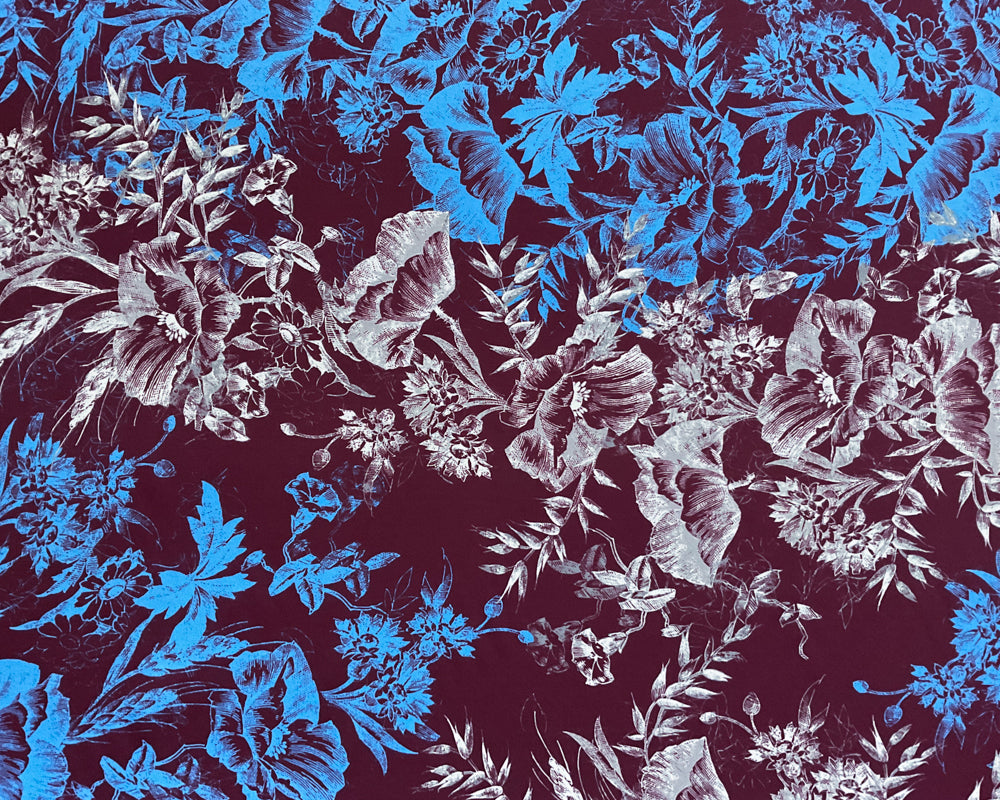 1 1/2 YD PC-Burgundy-Blue-Off White Floral Silk Designer Remnant Fabric