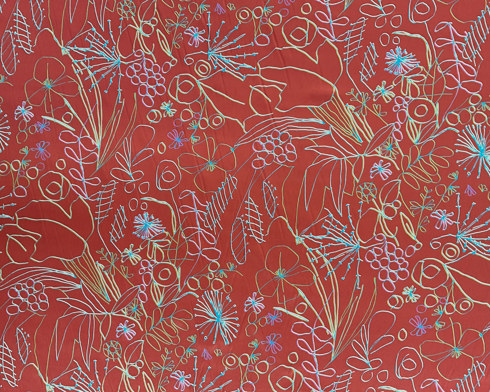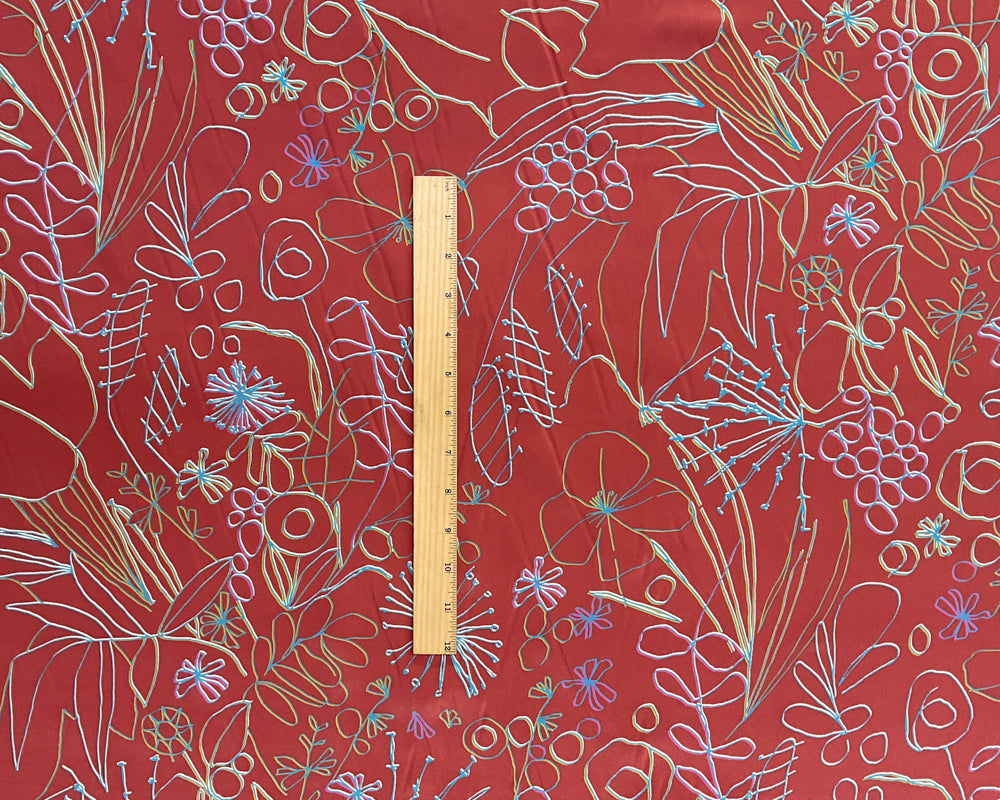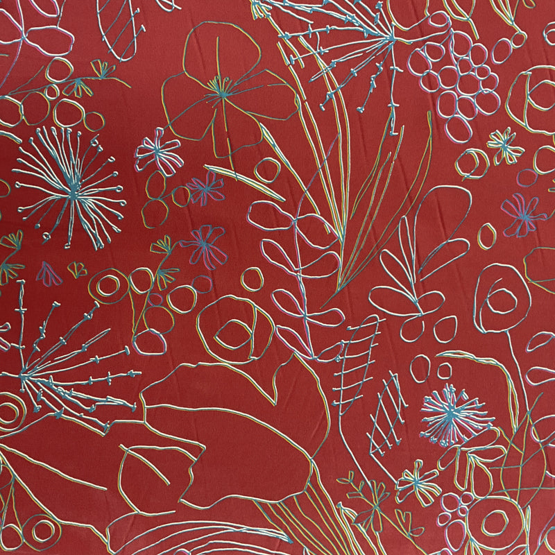 -4 YD PC-Brick Red-Yellow-Blue Sketch Floral Silk Remnant Fabric