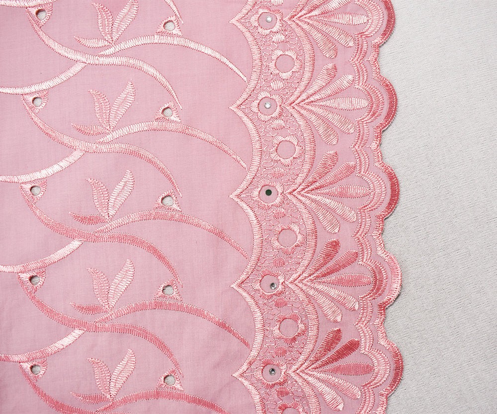 1 3/4 YD PC-Pink Poly-Cotton Embroidered Floral Scallop Rhinestone Woven Fabric