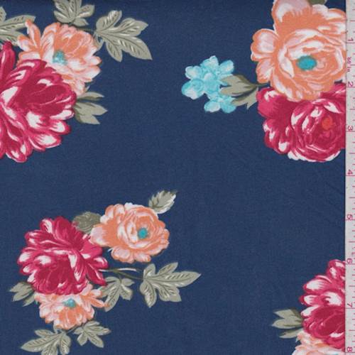 Navy/Red Floral Double Brushed Jersey Knit Fabric