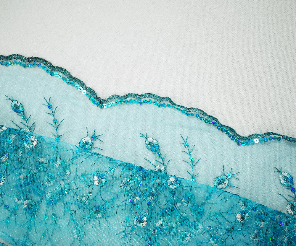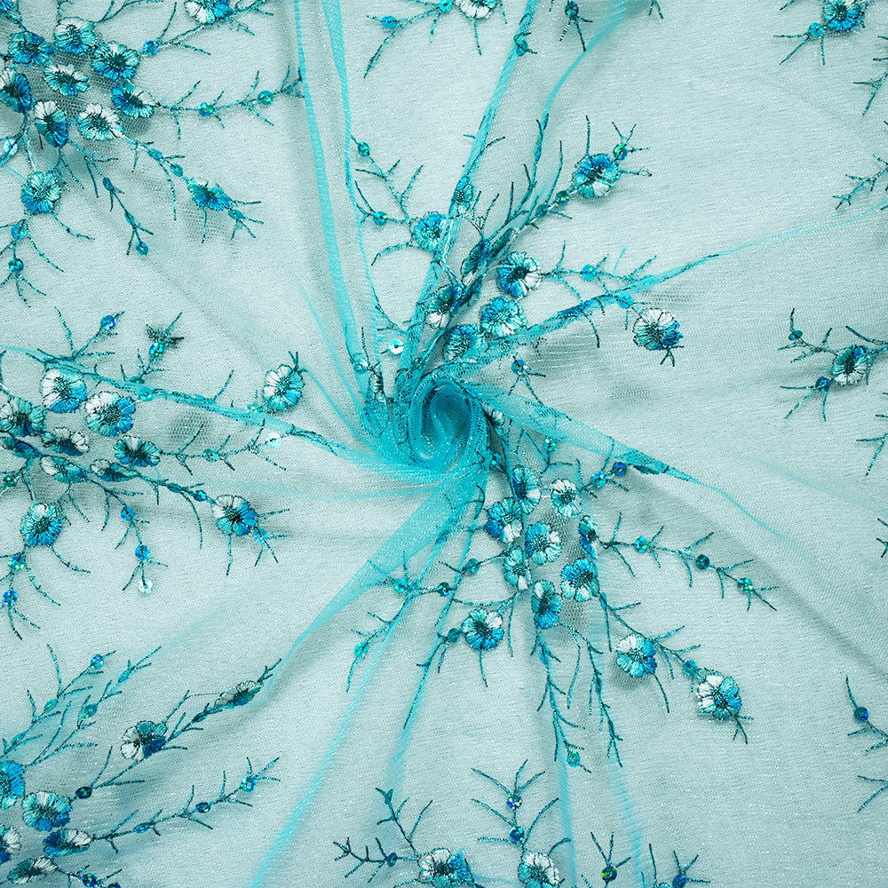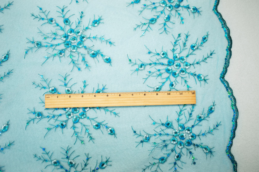 Aqua Teal-White Nylon Embroidered Floral Sequin Scallop Mesh Tulle Fabric