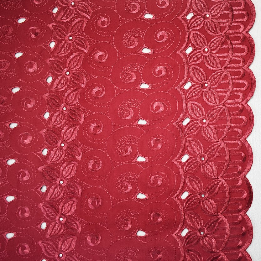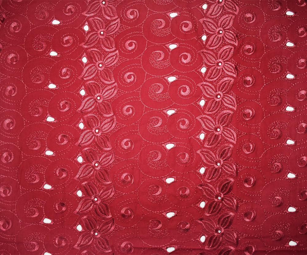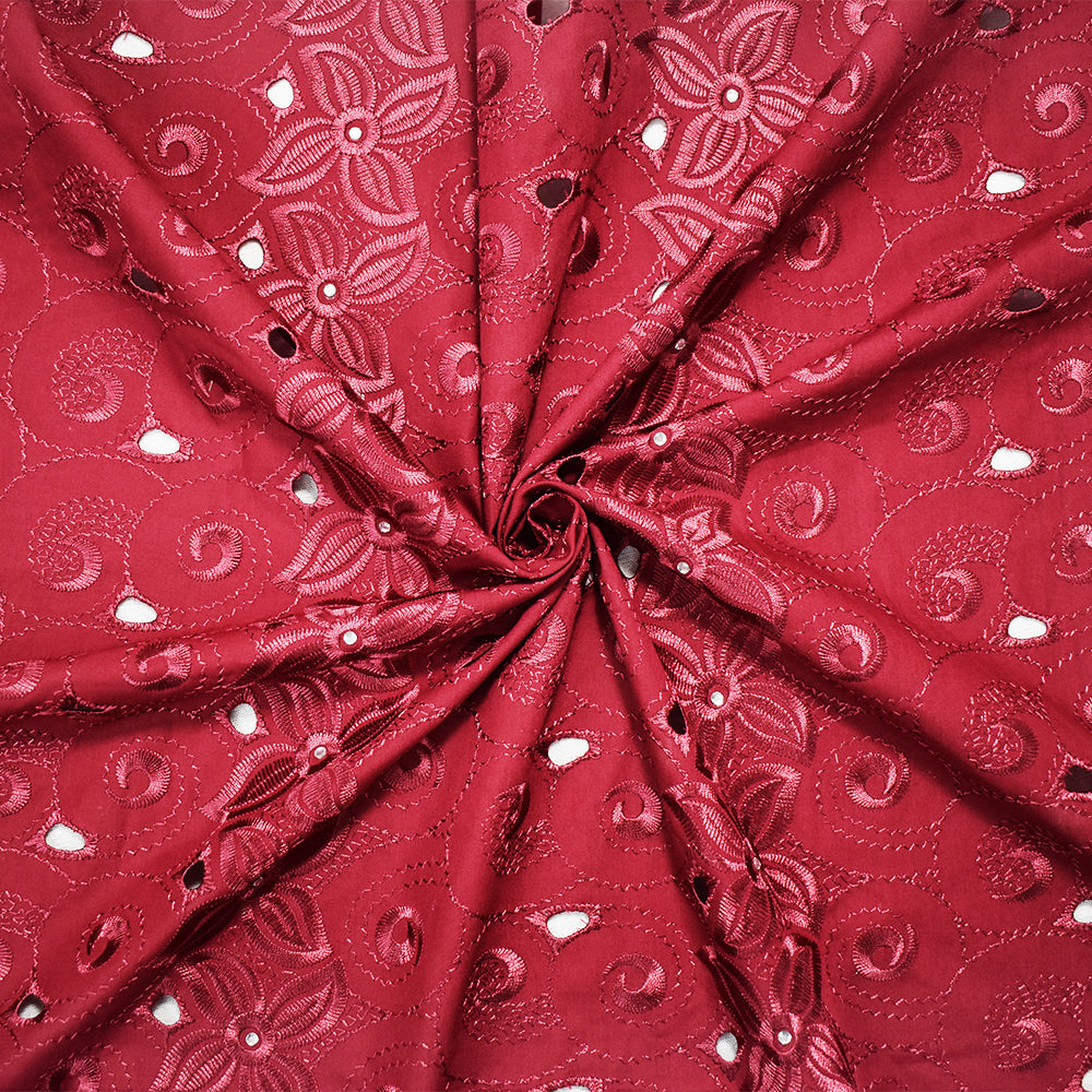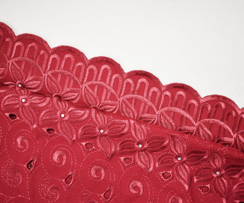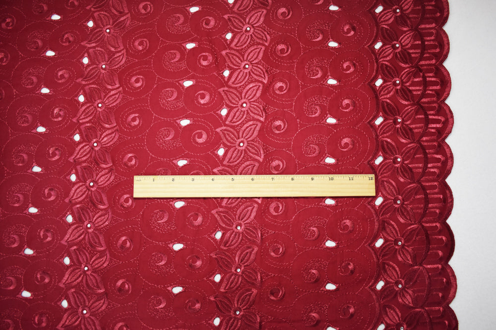 Red Poly-Cotton Embroidered Floral Swirl Scallop Rhinestone Woven Fabric