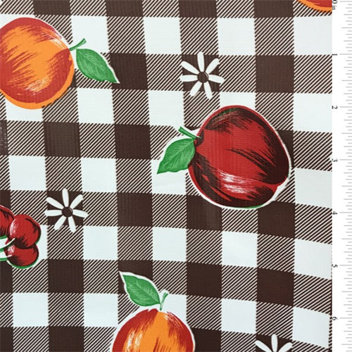 Red, Orange, Green, Brown, and White Apple, Cherry, Peach, and Daisy Print on Brown and White Check Oilcloth Fabric