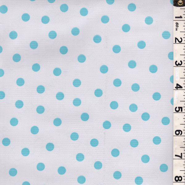 A 12 yard roll of OC033 Blue Dot Print on White Oilcloth Fabric Great for your breakfast or dinner table, patio, parties, BBQ's or picnic tables. Many use oilcloth for baby play areas, sewing/art projects, bags, totes, book covers, runners, placemats, gifts, or scrapbooks. Durable even when used with hot plates Face is 100% PVC Back is 65% Polyester 35% Cotton Mesh 45" Wide Waterproof and protected with a clear finish Fade, stain, and soil resistant Imported from Mexico Usually $120.00/roll
